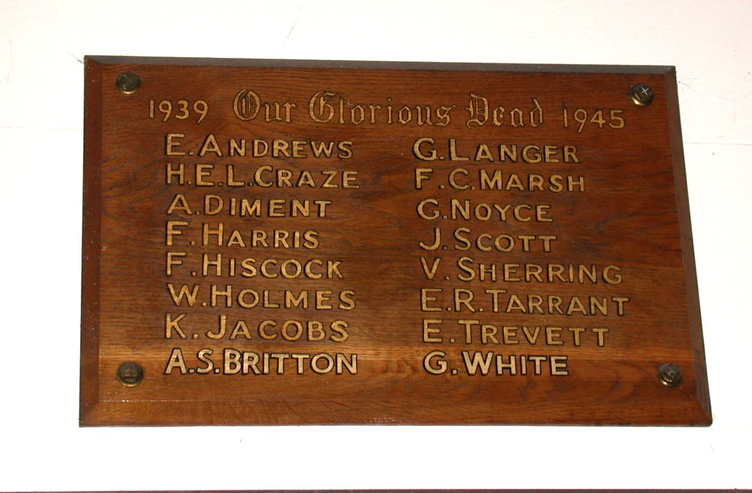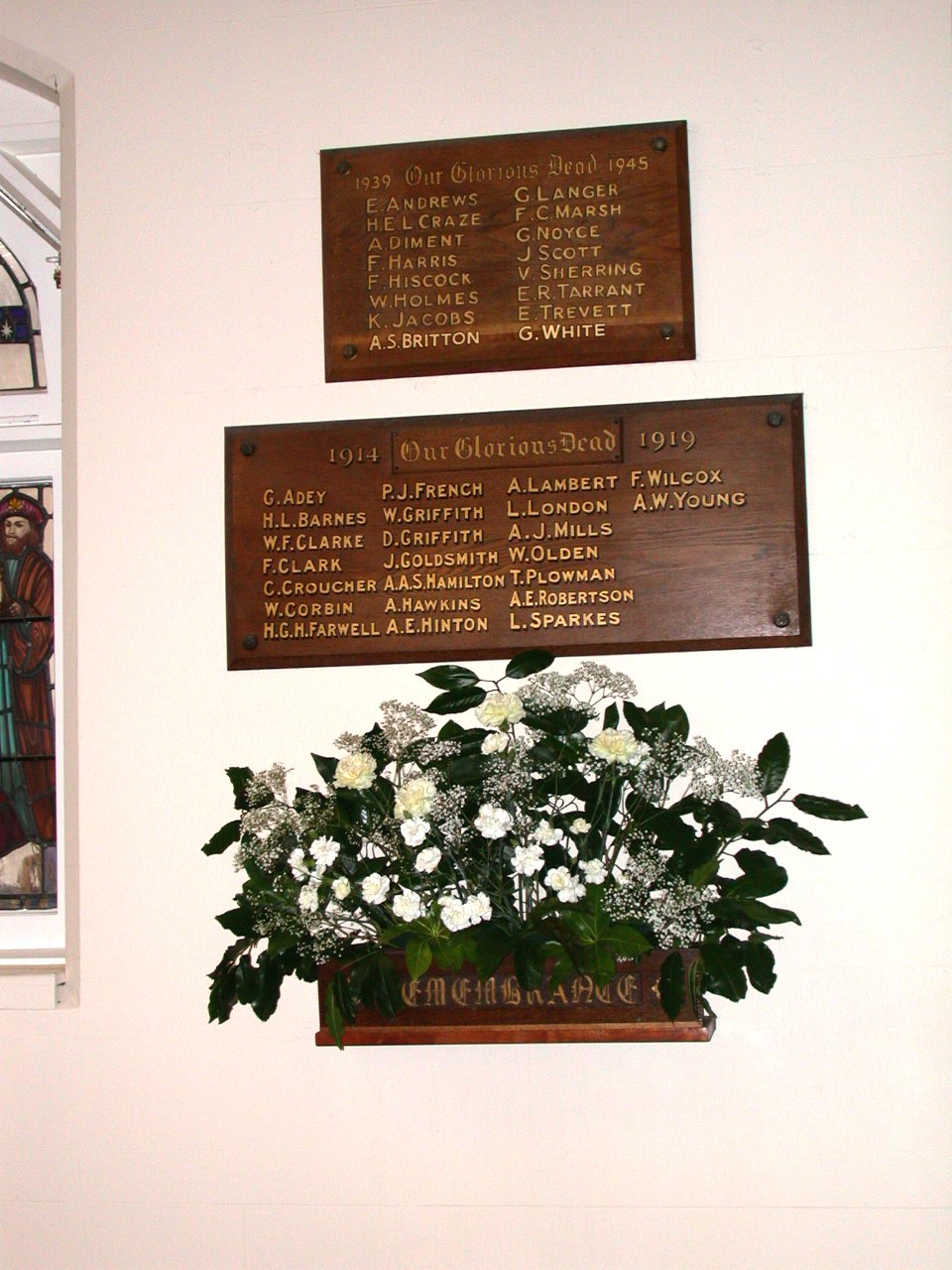 Wooden plaque on wall in All Saints Church above Great War memorial.