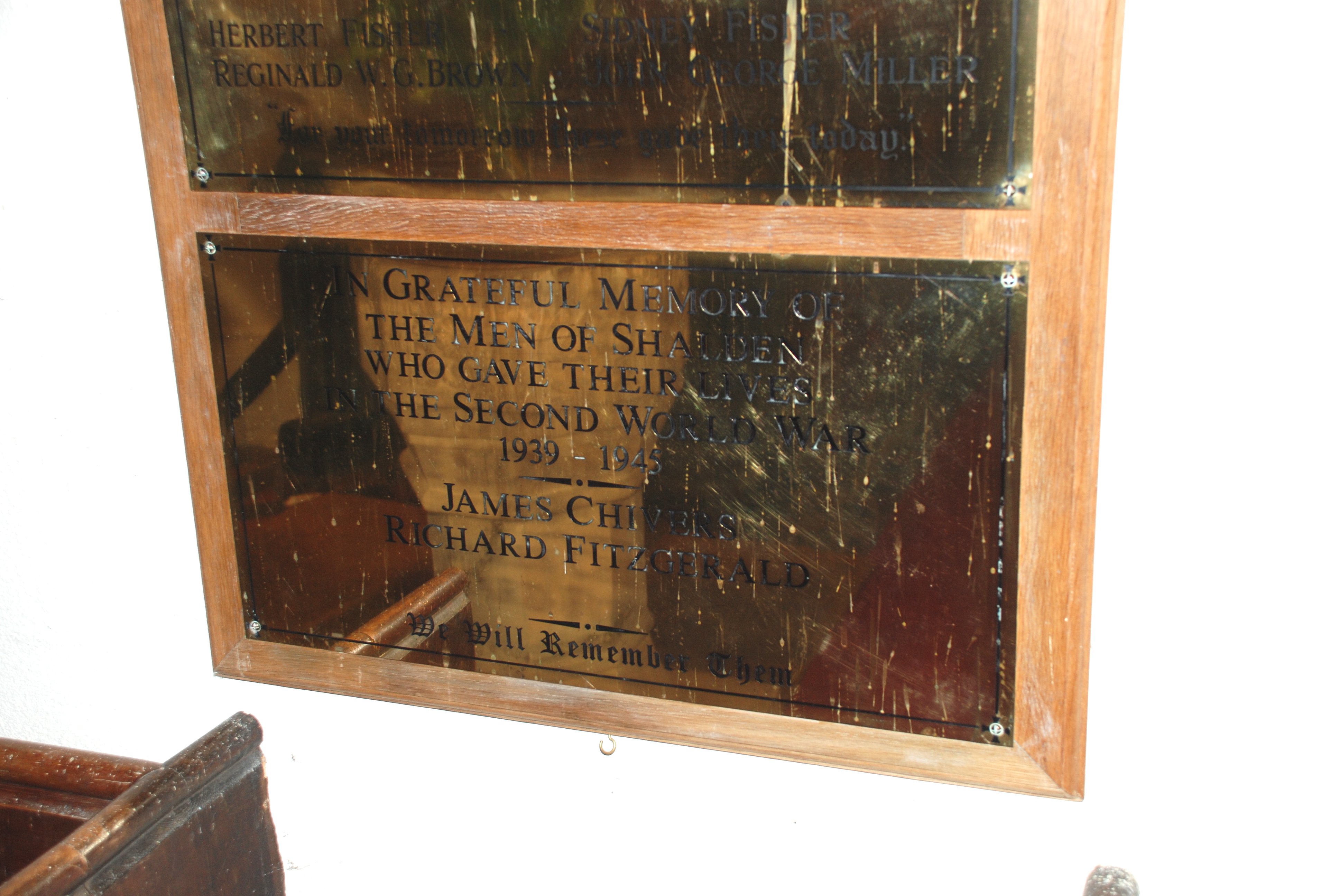 Brass plaque on wood on back wall underneath Great War plaque under windows in St Peter & St Paul's Church.
