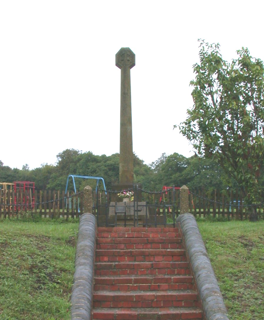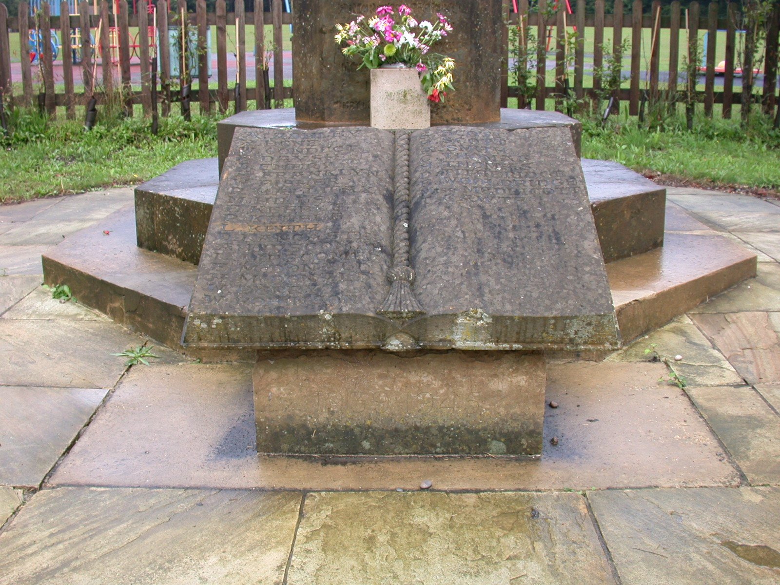 Stone tablet in the form of a book in front of the Great War memorial on bank by road junction