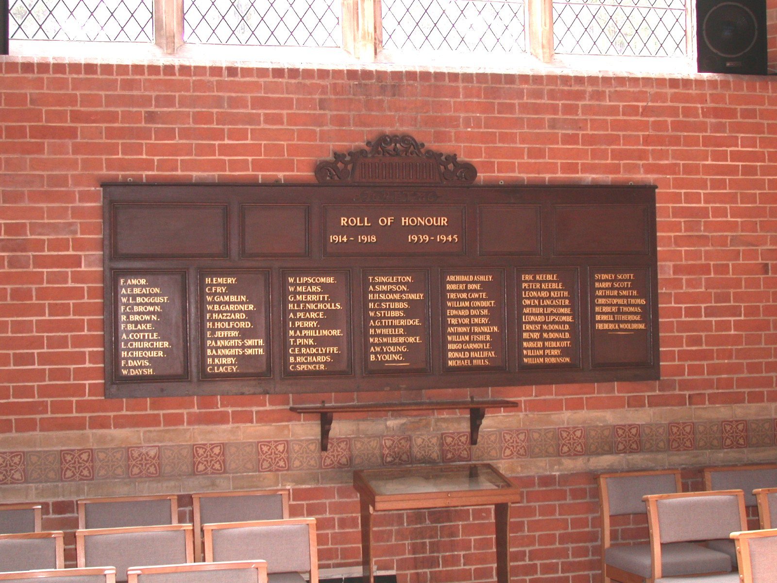 Wooden roll of honour on wall in St John the Baptist Church to both wars.