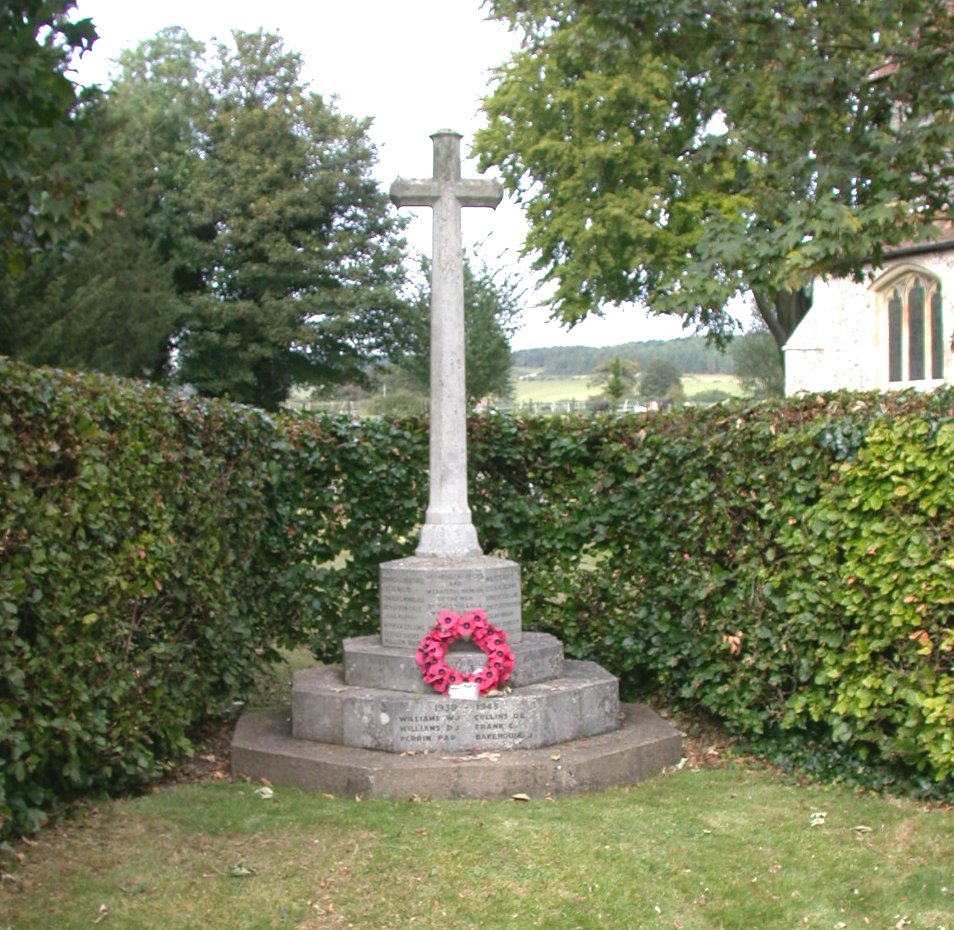 Stone cross set back into recess in St Peter's Churchyard boundry, WW2 names added on front face of next to bottom step.