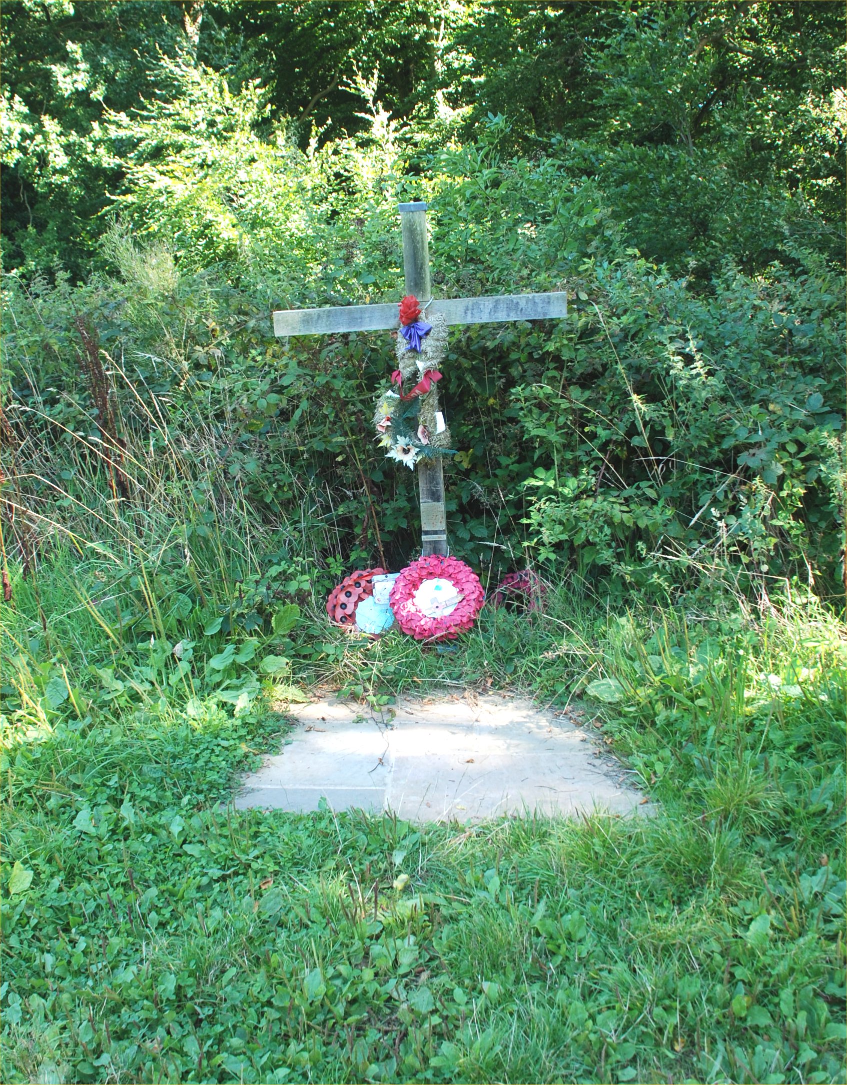 Along the avenue in the grounds of the house is a wooden cross with 2 small metal plaques on, plaques becoming corroded and difficult to read.