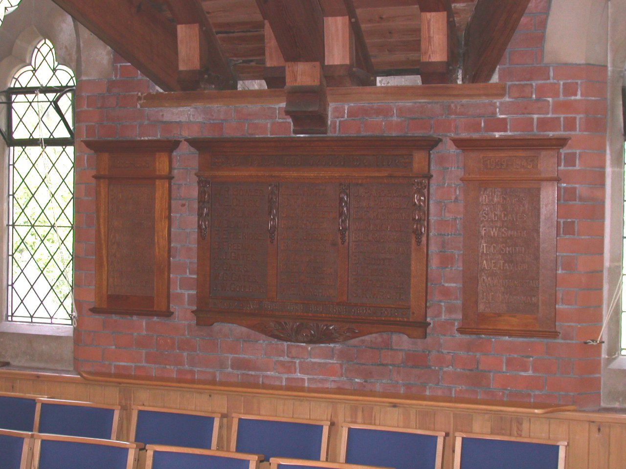 Two wooden tablets on wall in St Luke's Church either side of Great War memorial.