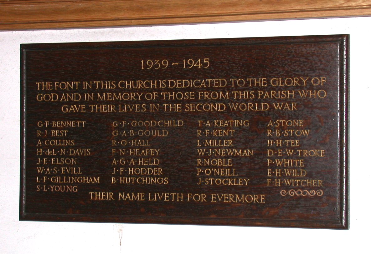 Wooden plaque on wall in church under Great War memorial.