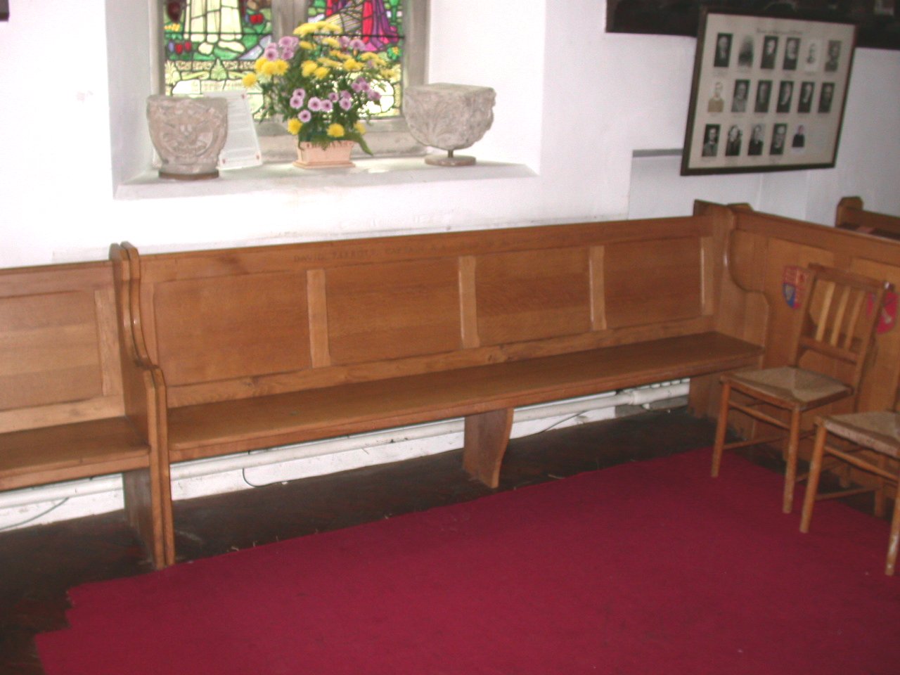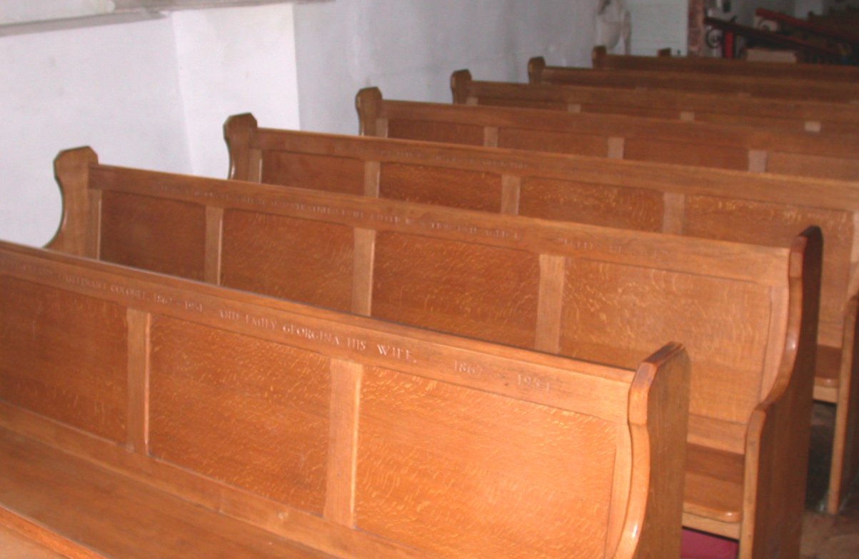 Wooden pew at edge in church, inscription on back at front.