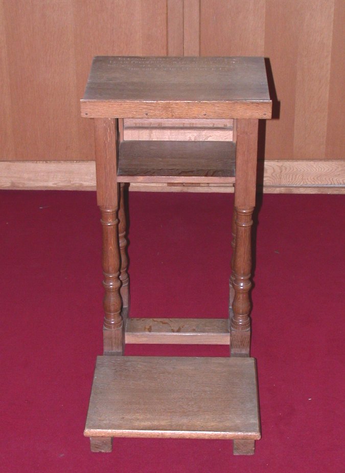 Wooden kneeling plinth and book stand, inscription on top.