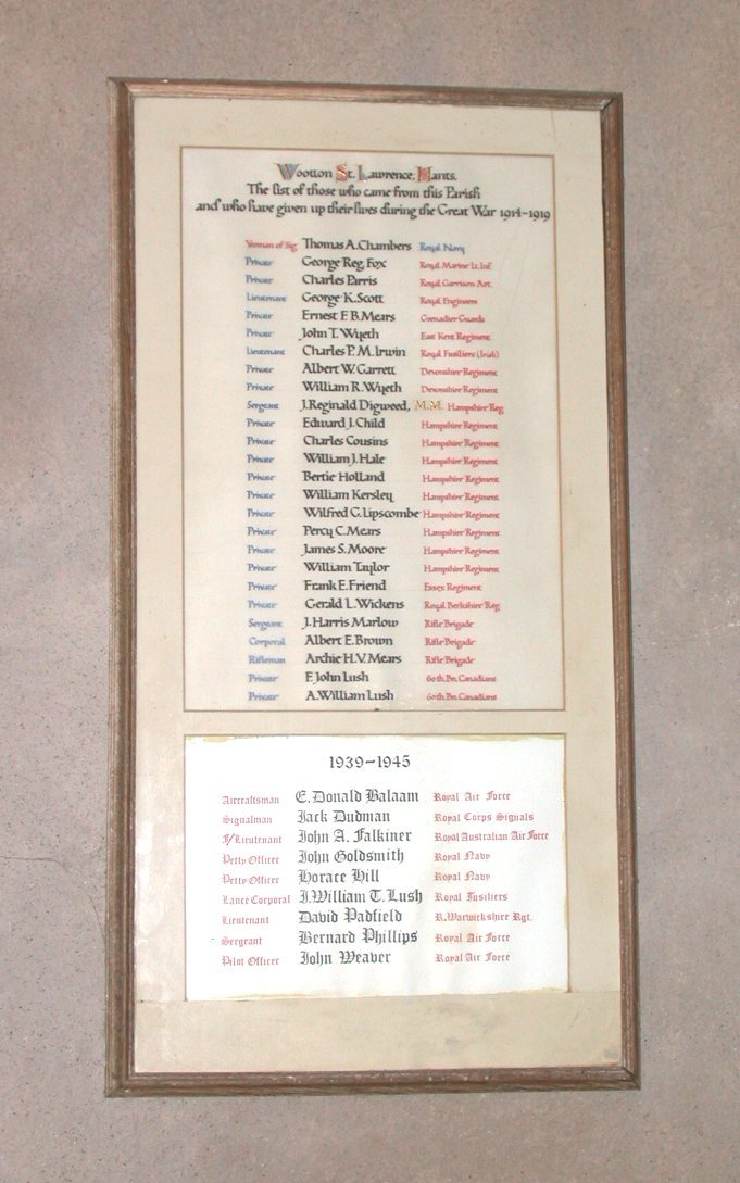 Hand written scroll in frame on wall in St Lawrence's Church.