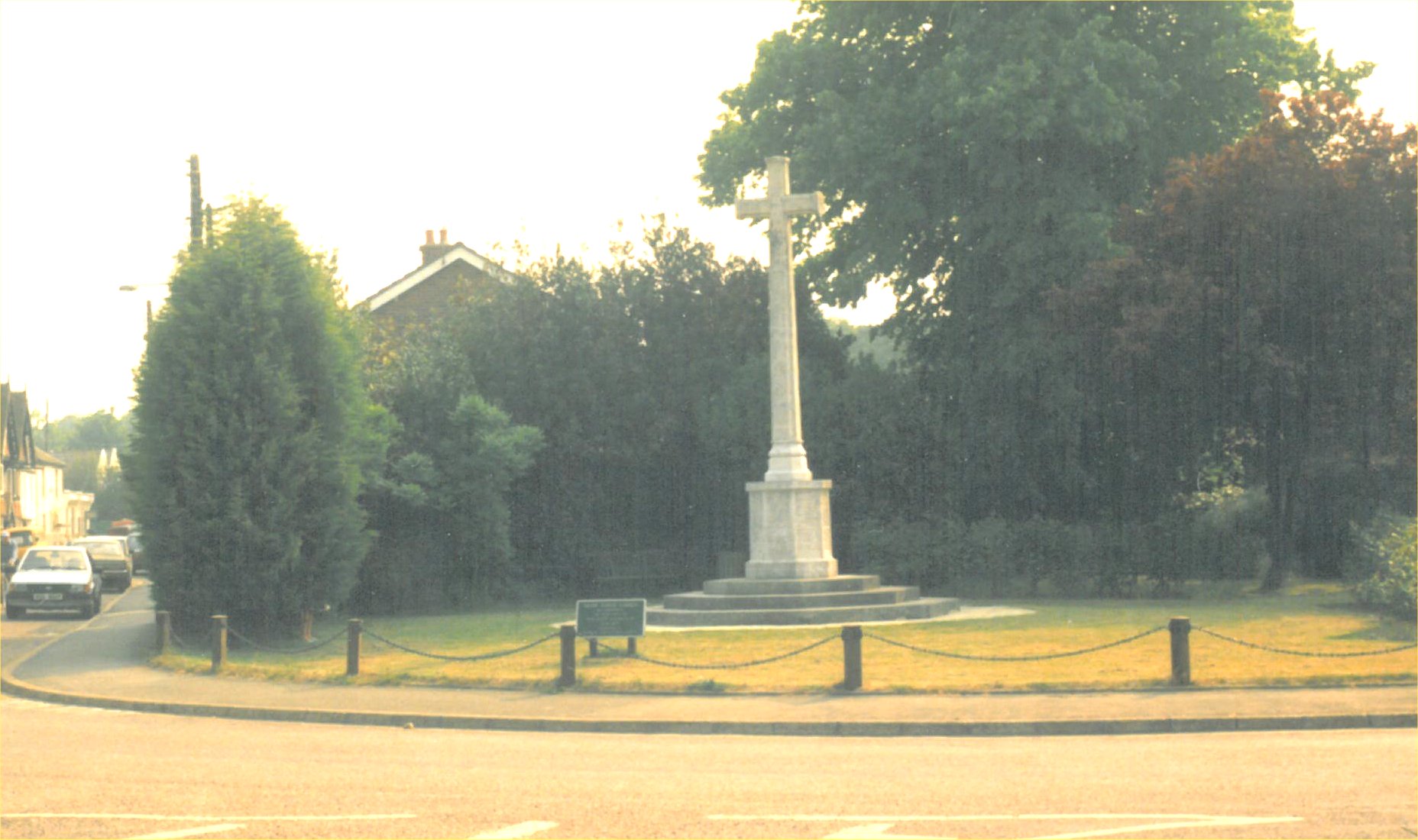 Stone cross in silver jubilee gardens on road junction, inscription on faces of plinth.