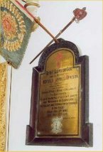 Wooden screen with brass panel at rear of Holy Trinity Church by bell tower.