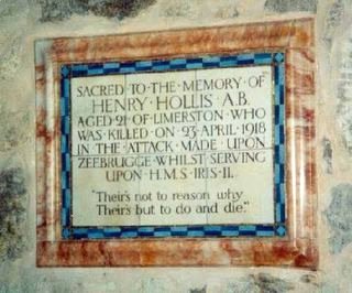 Sacred to the memory of Henry Hollis A.B. aged 21 of Limerston who was killed on 23 April 1918 in the attack made upon Zeebrugge whilst serving upon H.M.S. Iris II.