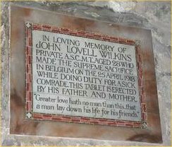 In loving memory of John Lovell Wilkins Private A.S.C.,M.T. aged 28 who made the supreme sacrifice in Belgium on the 25 April 1918 while doing his duty for a sick comrade. This tablet is erested by his Father and Mother. "Greater love hath no man than this, that a man lay down hie life for his friends."