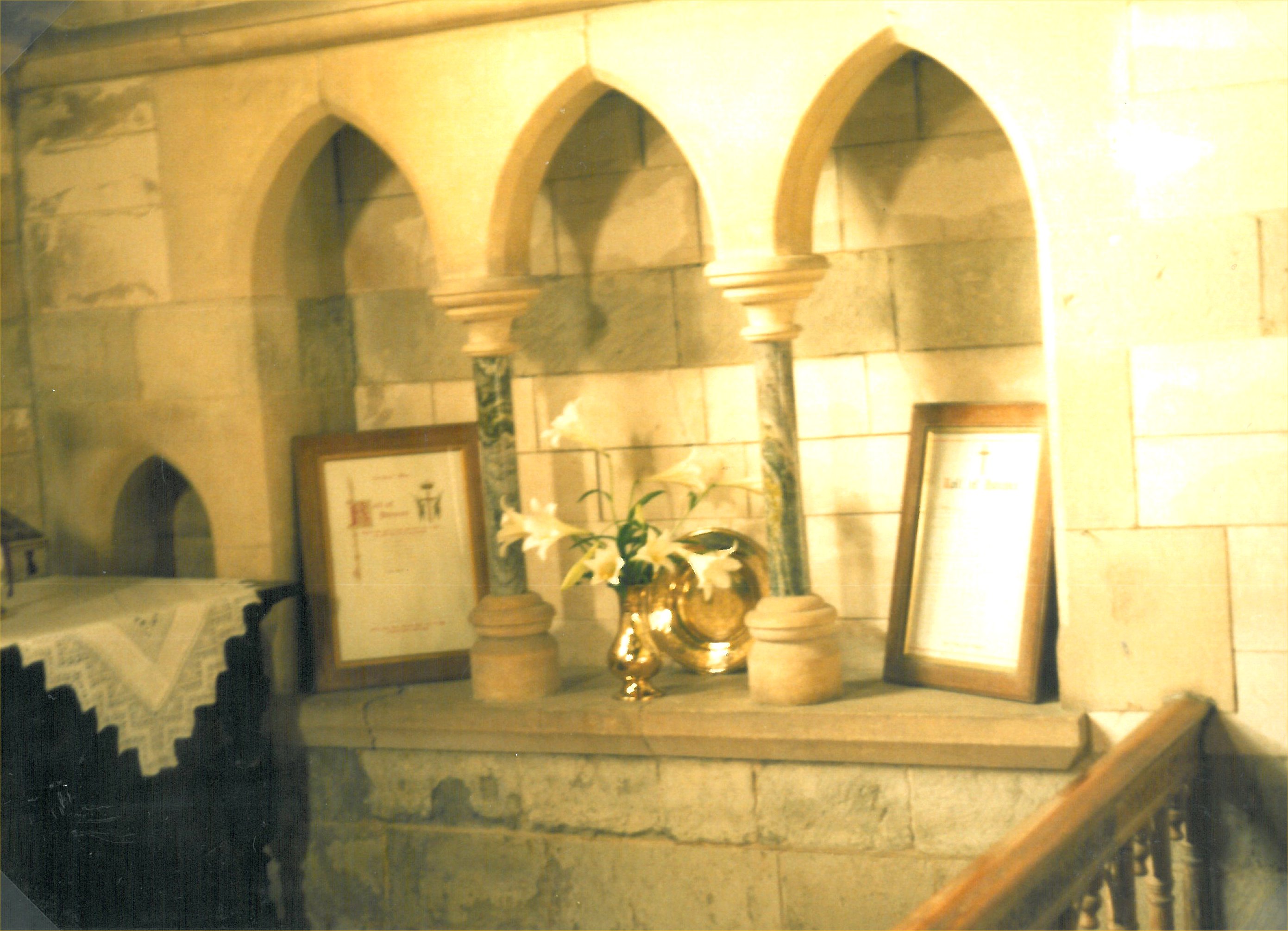 Printed & hand written scroll framed in alcove near altar, left one in photo. (Ernest Kerley appears to have been added later.)