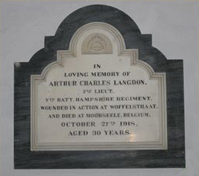 In loving memory of Arthur Charles Langdon, 2nd Lieut. 7th Batt. Hampshire Regiment, wounded in action at Waffelstraat, and died at Moorseele, Belgium, October 27th 1918, aged 30 years.