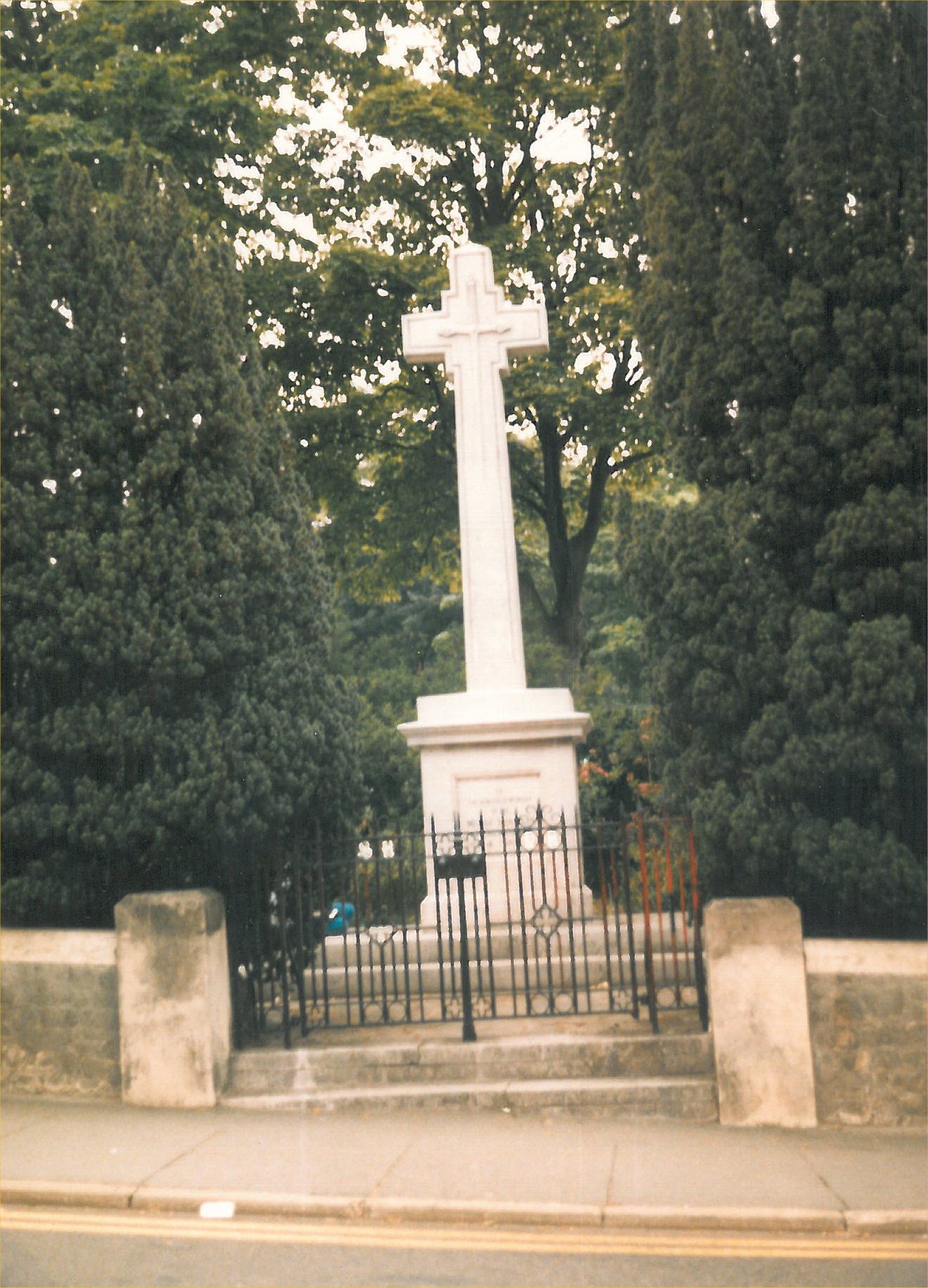 Stone cross on roadjunction set back in village, inscriptions on plinth faces.