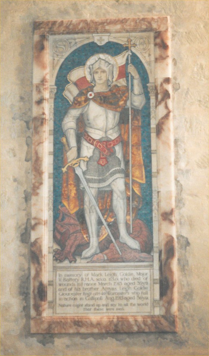 In memory of Mark Leigh Goldie, Major V. Battery R.H.A. M.V.O. D.S.O. who died of wounds in France March 1915 aged 39 years and of his brother Amyas Leigh Goldie Gloucester Regt attd. 4th Worcesters who fell in action in Gallipoli Aug. 1915 aged 36 yrs. Nature might stand up and say to all the world that these were men