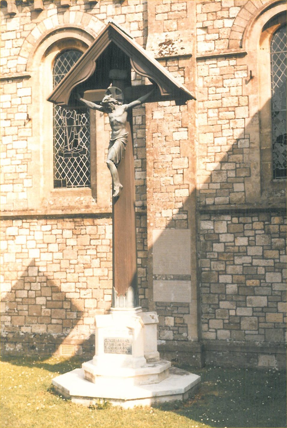 Cavalry in St Mildred's churchyard with a tablet on the outside of the chuch wall behind.