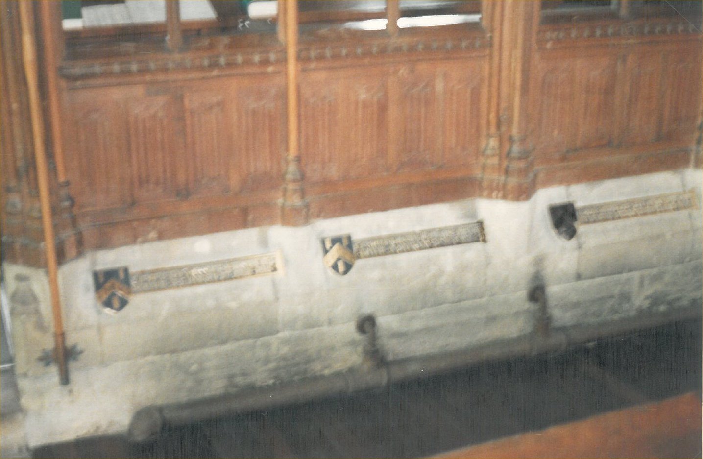Brass plaques with crests on wall under choir screen in St Mary & St Rhadegunde Church.