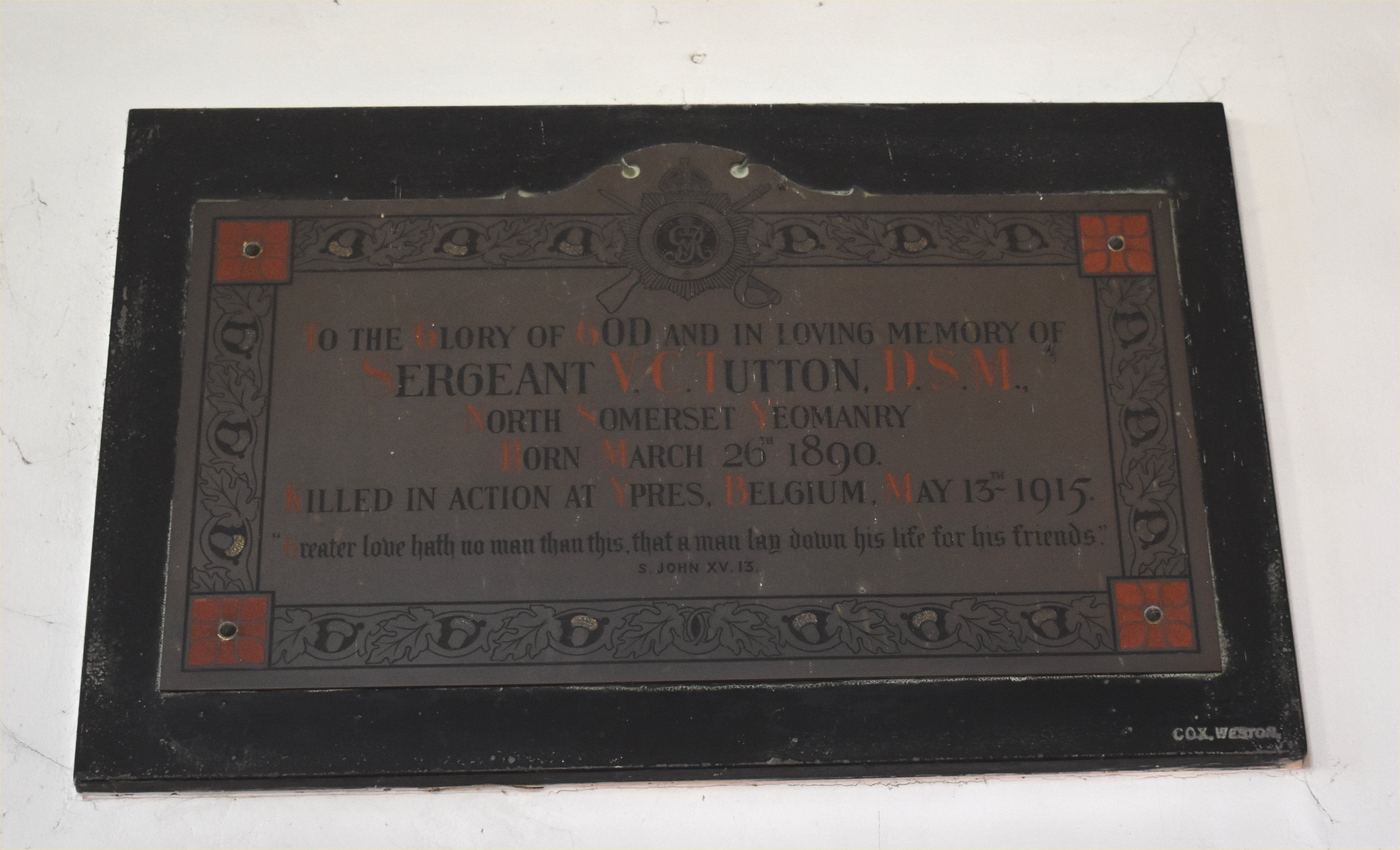 To the Glory of God and in loving memory of Sergeant V.C. Tutton. D.S.M. North Somerset Yeomanry Born March 26th 1890 Killed in action at Ypres, Belgium, May 13th 1915. "Greater love hath no man than this, that a man lay down his life for his friends." S.John XV.13.