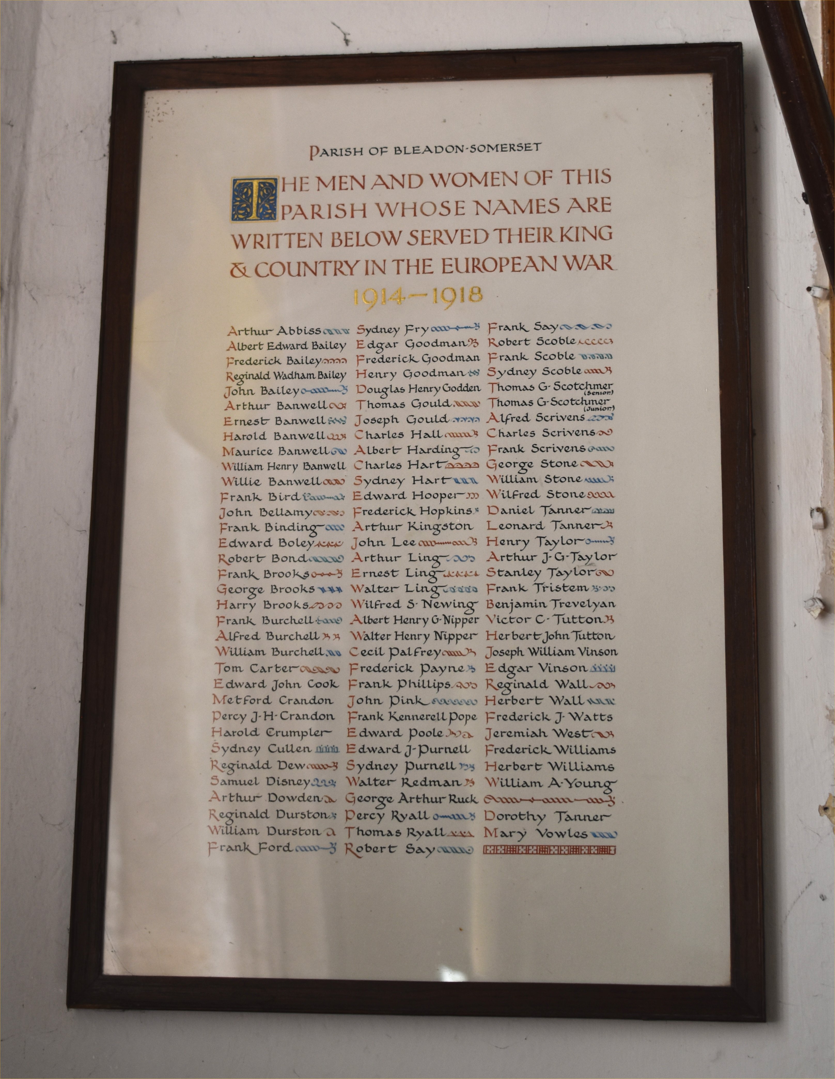 Parish of Bleadon-Somerset The men and women of this parish whose names are written below served their King & Country in the European War 1914-1918