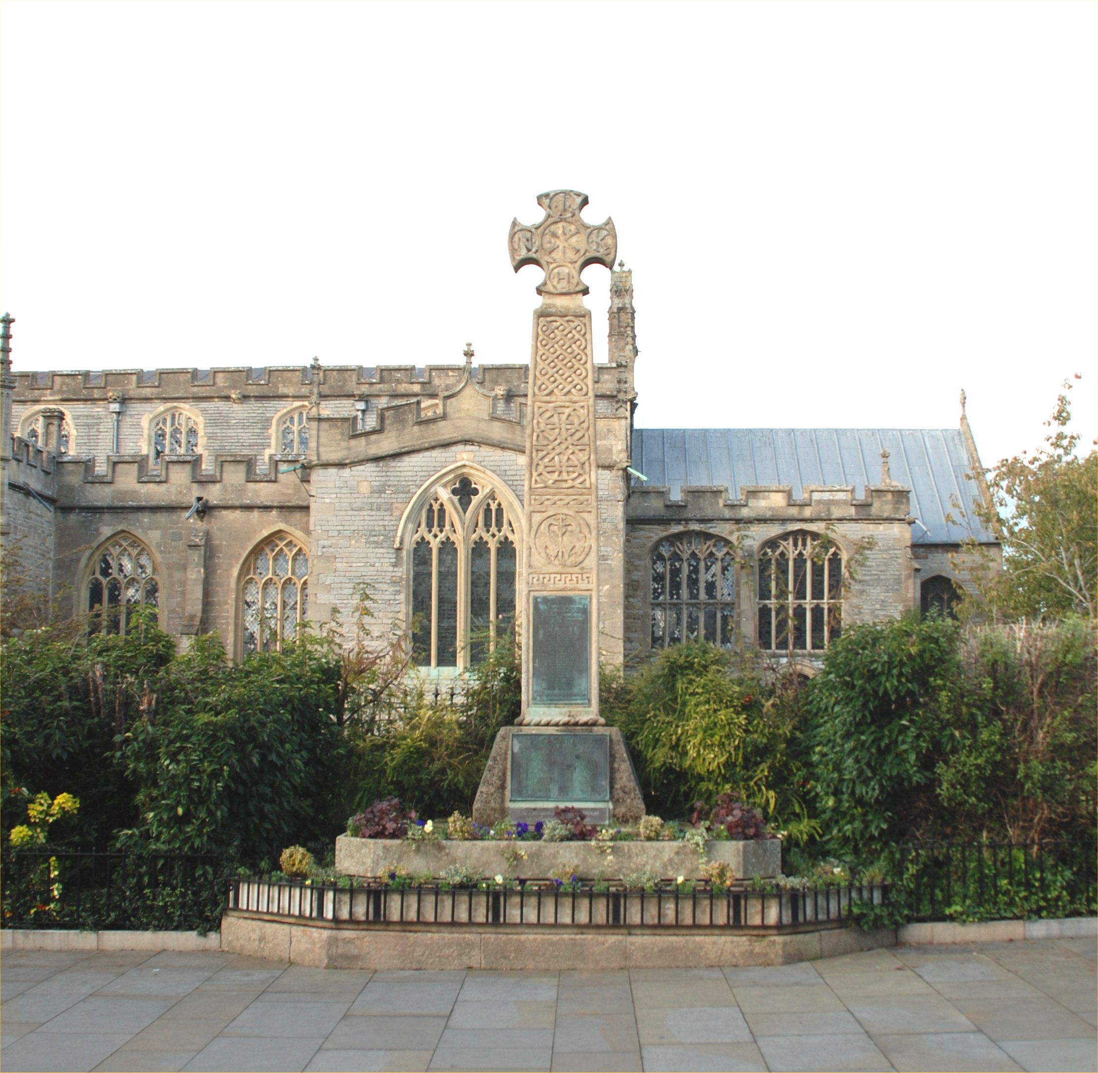 Stone cross on plinth set back on pavement just outside St John the Baptist Church, bronze plaque on faces plinth.