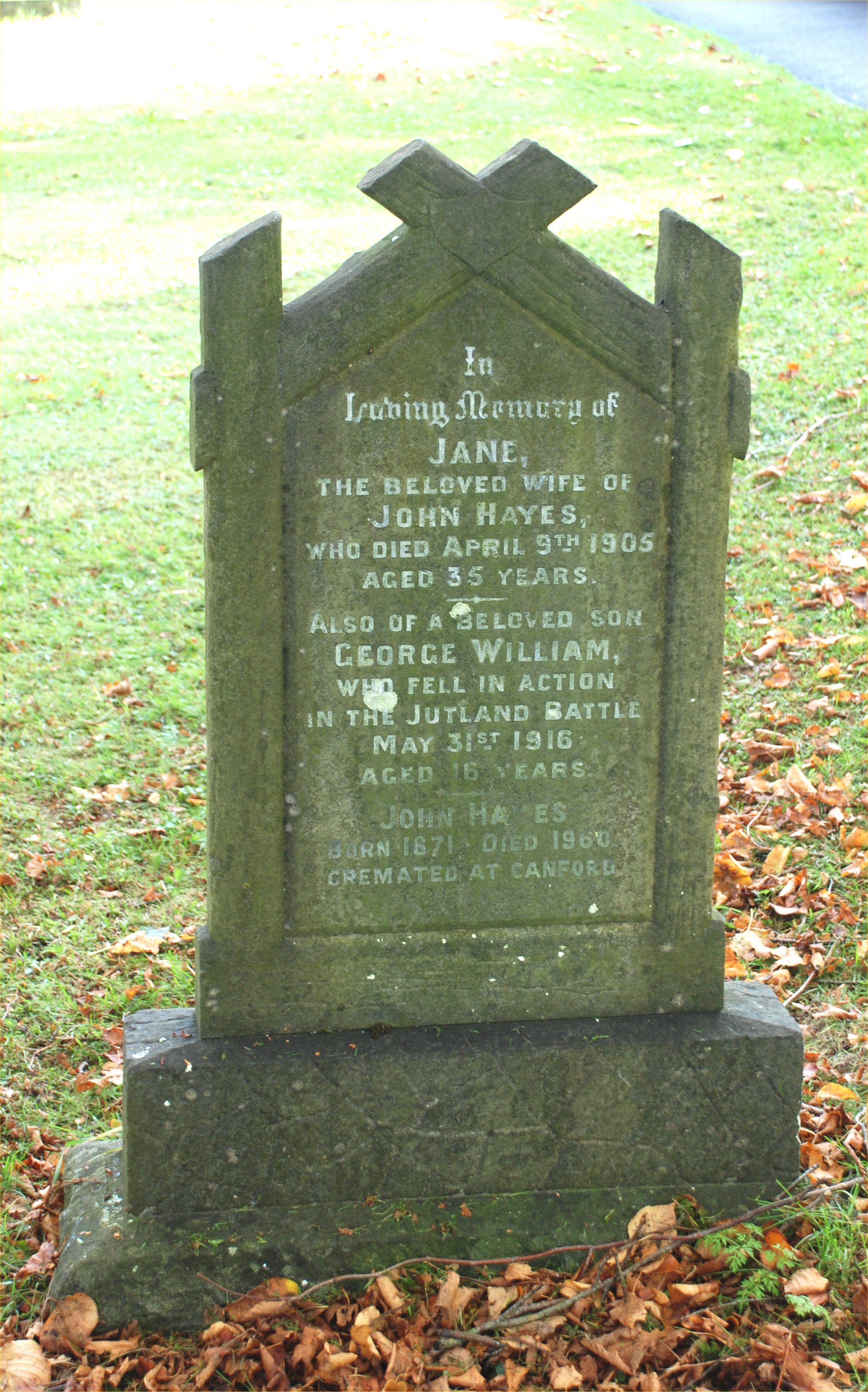 In Loving Memory of Jane, the beloved wife of John Hayes, who died April 9th 1905 aged 35 years. Also of a beloved son George William, who fell in action in the Jutland Battle May 31st 1916 aged 16 years John Hayes Born 1871 Died 1960 cremated at Canford
