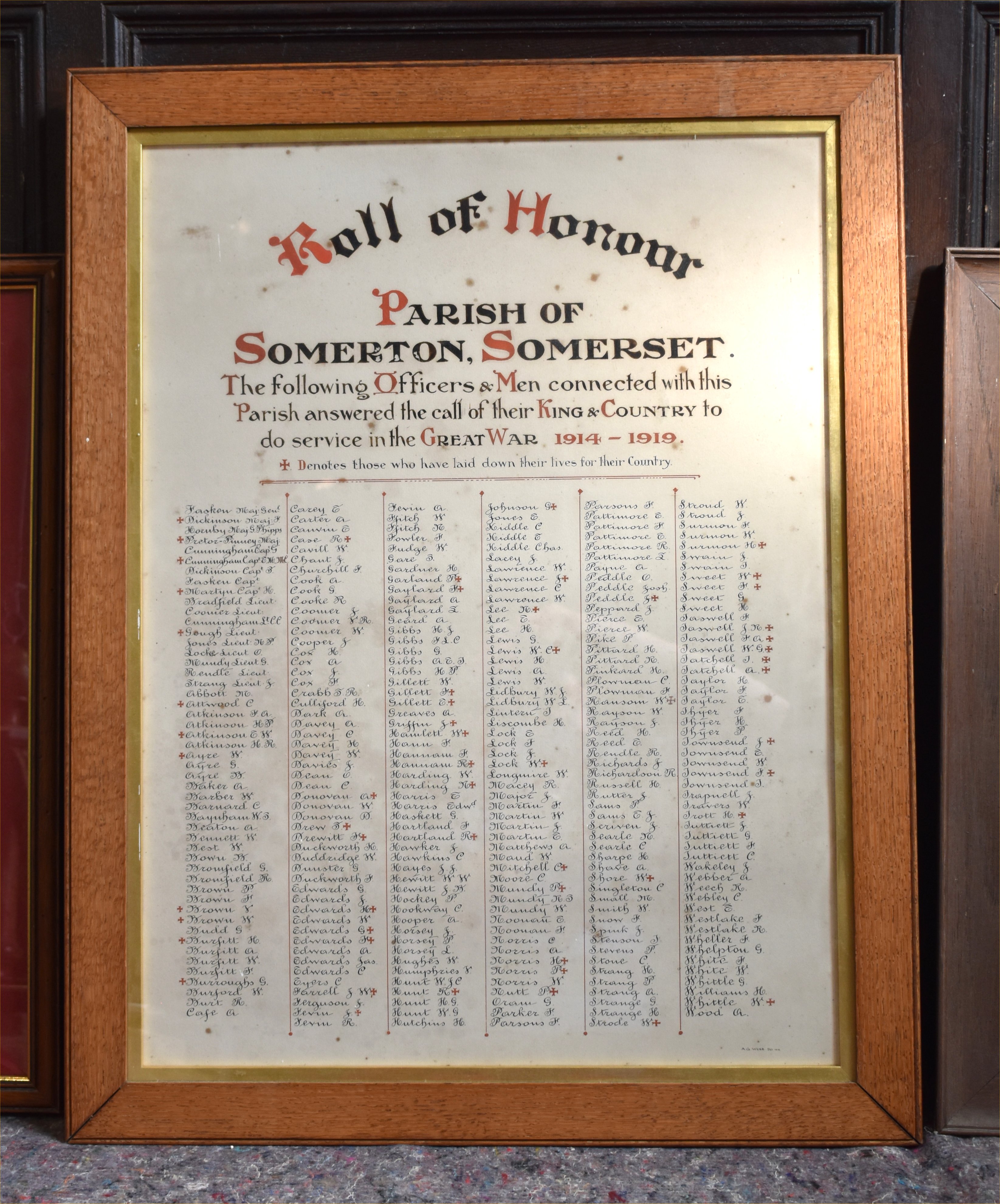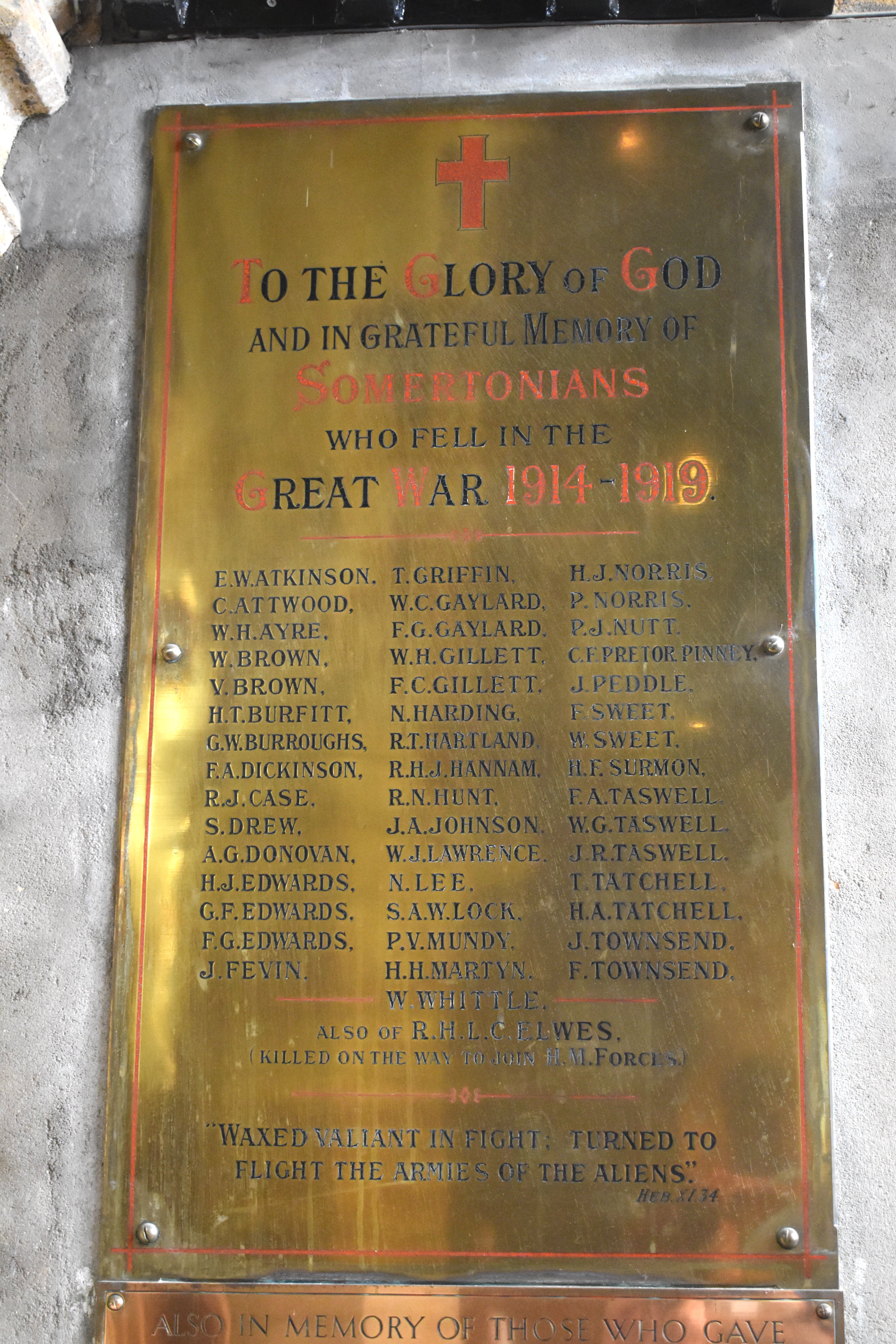 + To the Glory of God and in grateful Memory of of Somertonians who fell in the Great War 1914-1919.