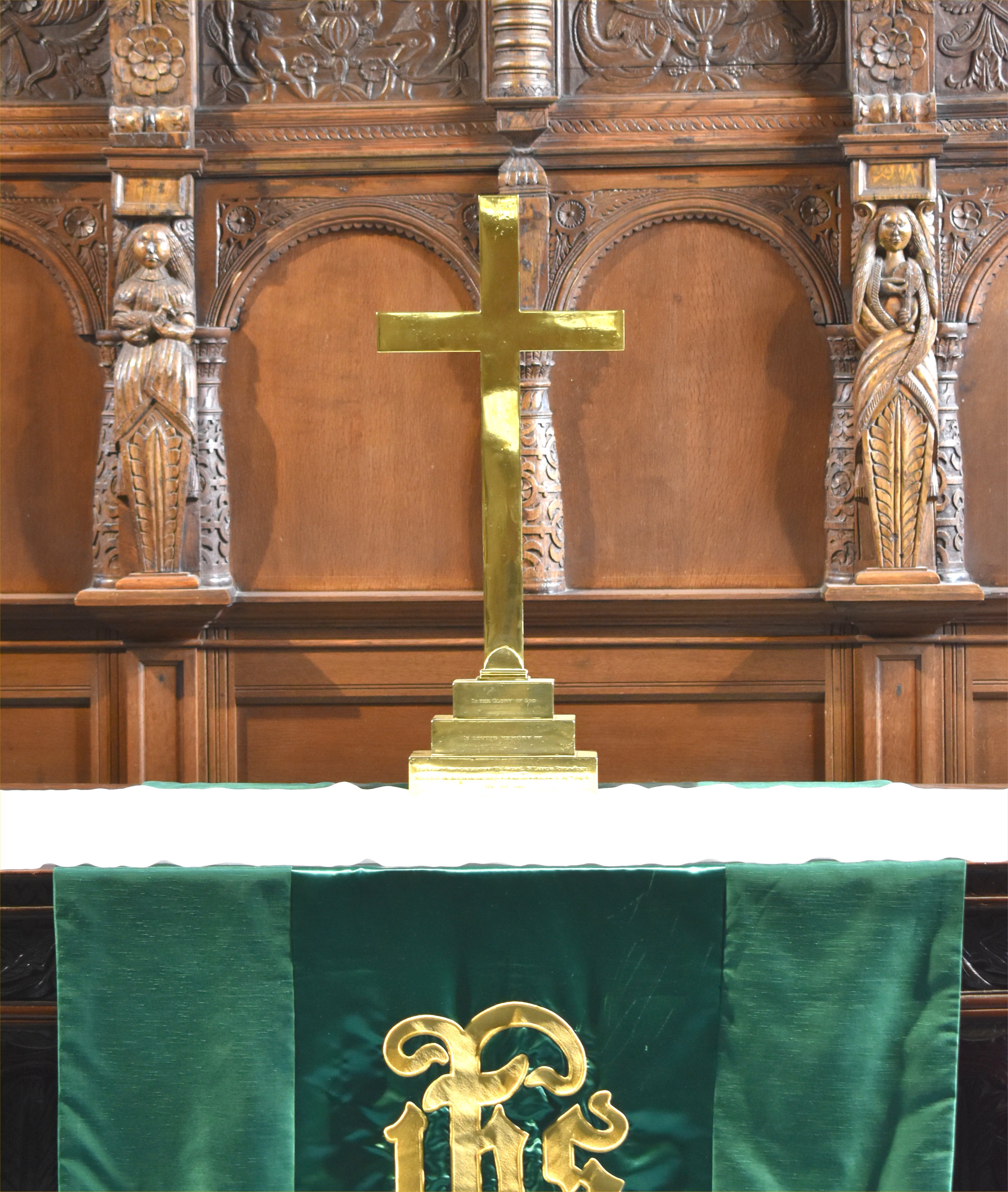 Brass cross on high altar in St Michael & All Angels Church, inscriptions on front of altar plinths.