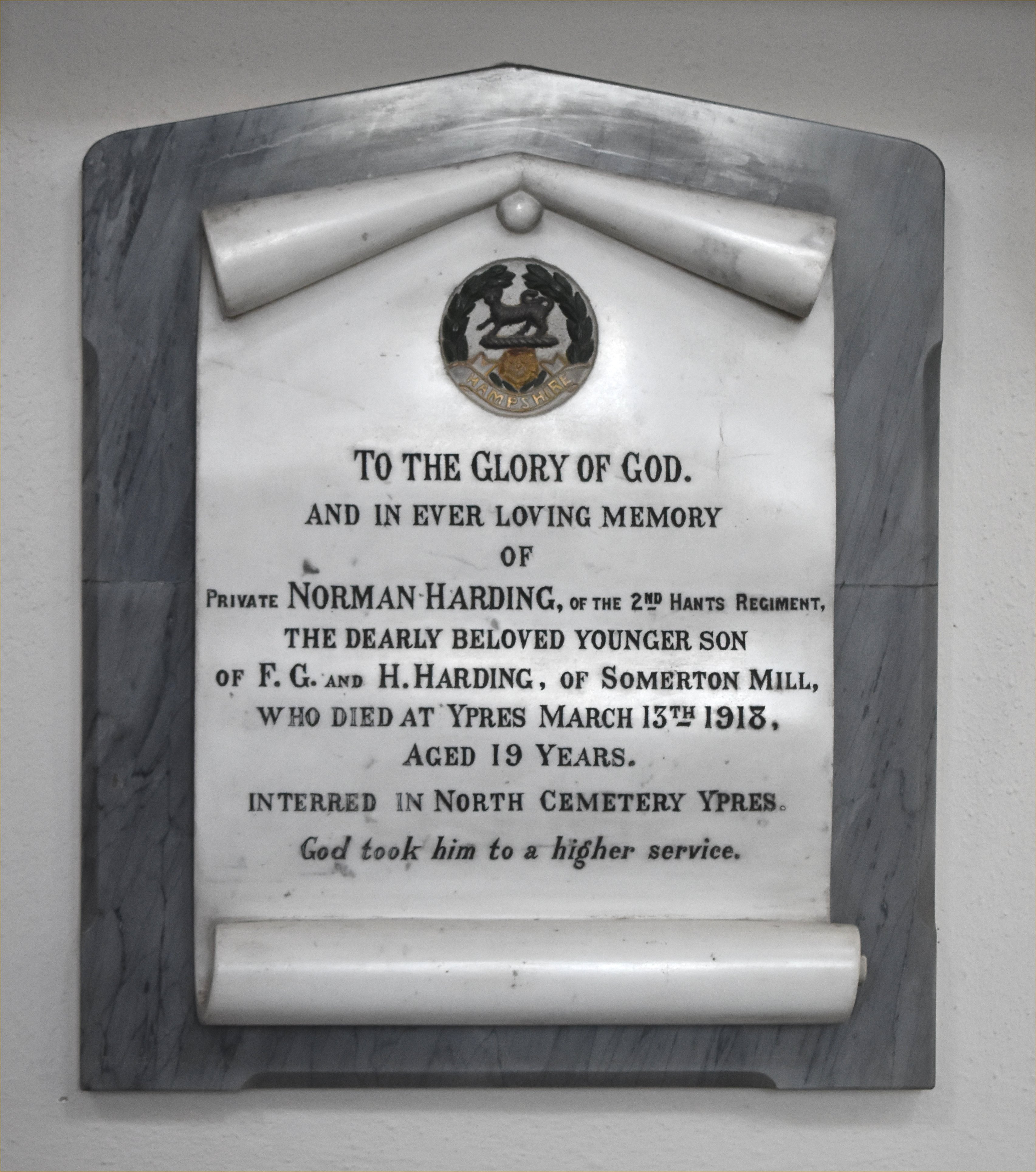 To the Glory of God. and in ever loving memory of Private Norman Harding, of the 2nd Hants Regiment, the dearly beloved younger son of F.G. and H. Harding, of Somerton Mill, who died at Ypres March 13th 1918, aged 19 years. Interred in North Cemetery Ypres God took him to a higher service.