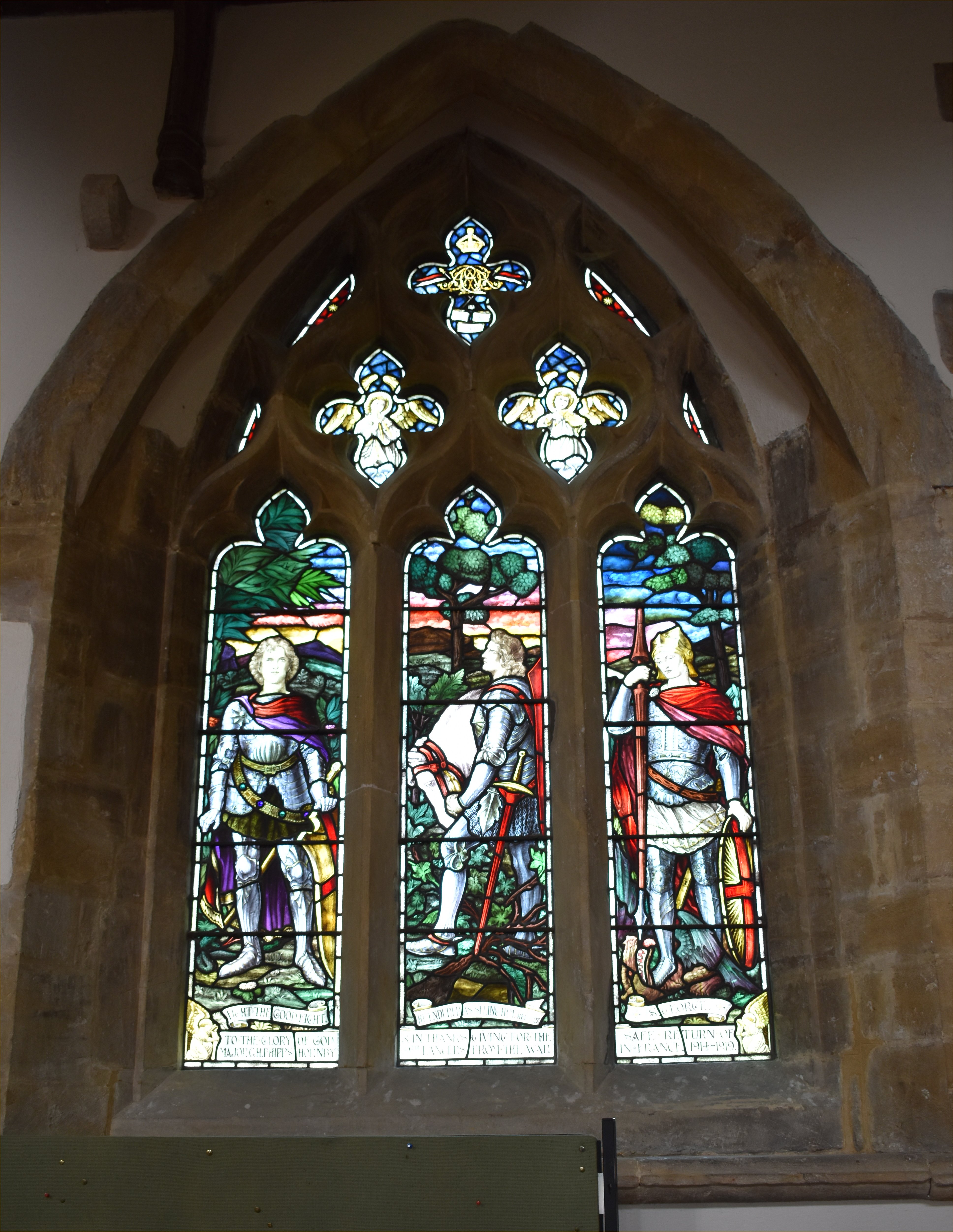 Window in St Michael & All Angels Church, inscriptions at bottom of each pane.