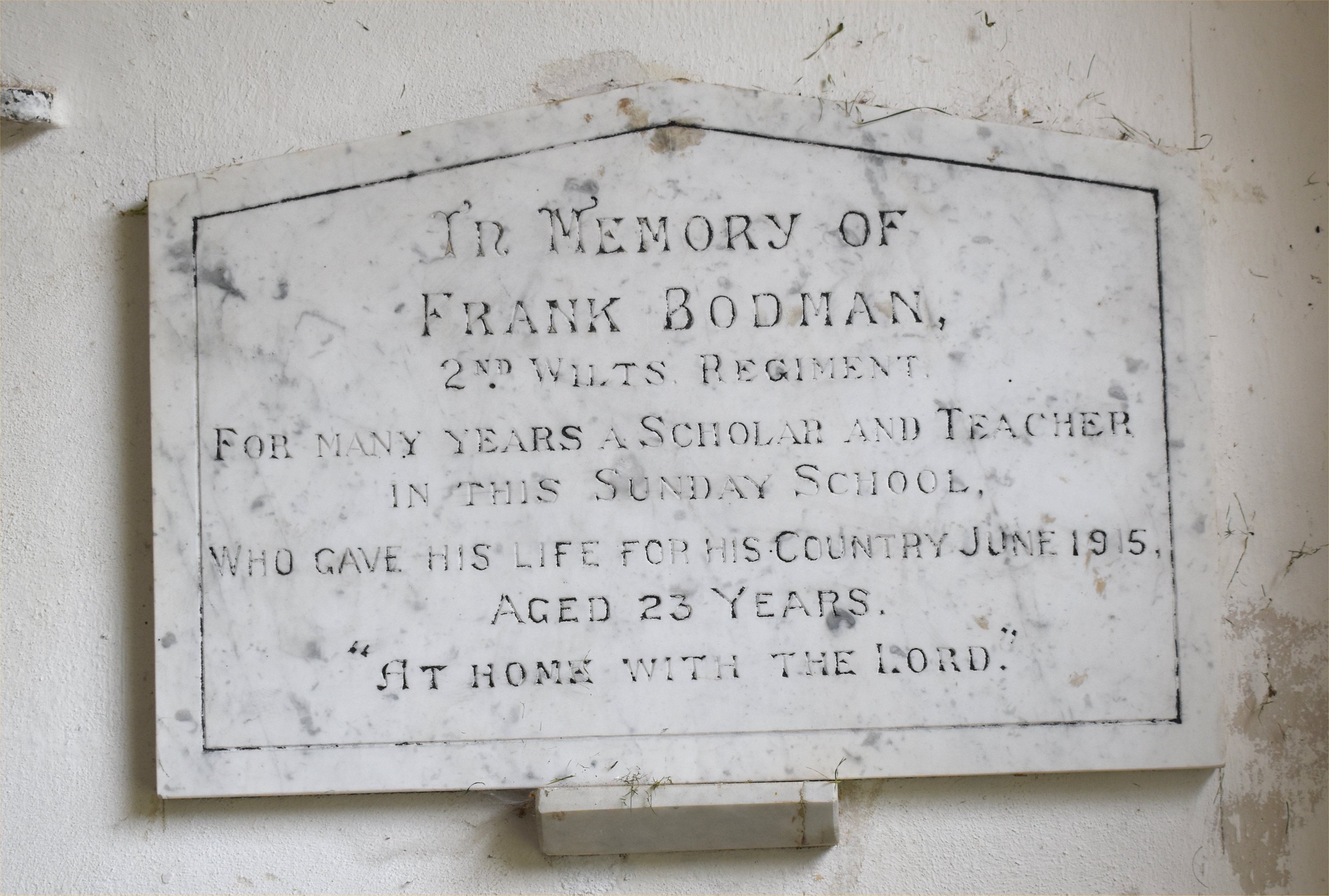 In Memory of Frank Bodman, 2nd Wilt. Regiment. For many years a Scholar and Teacher in this Sunday School, who gave his life for his Country June 1915, Aged 23 Years. "At home with the Lord."