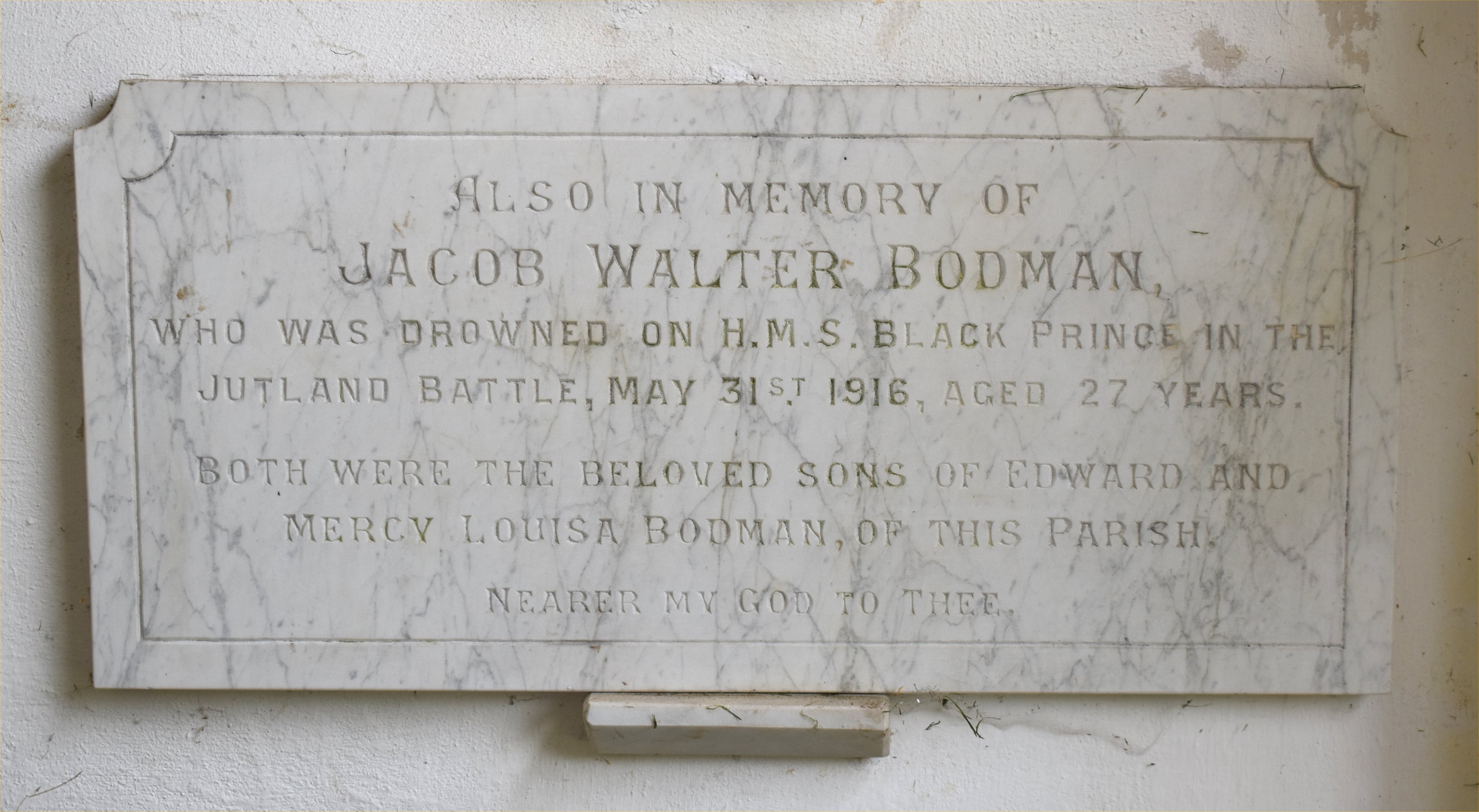 Also in Memory of Jacob Walter Bodman, who was drowned on H.M.S. Black Prince in the Jutland battle, May 31st 1916, aged 27 years. Both were the beloved sons of Edward and Mercy Louisa Bodman, of this parish Nearer my God to thee.
