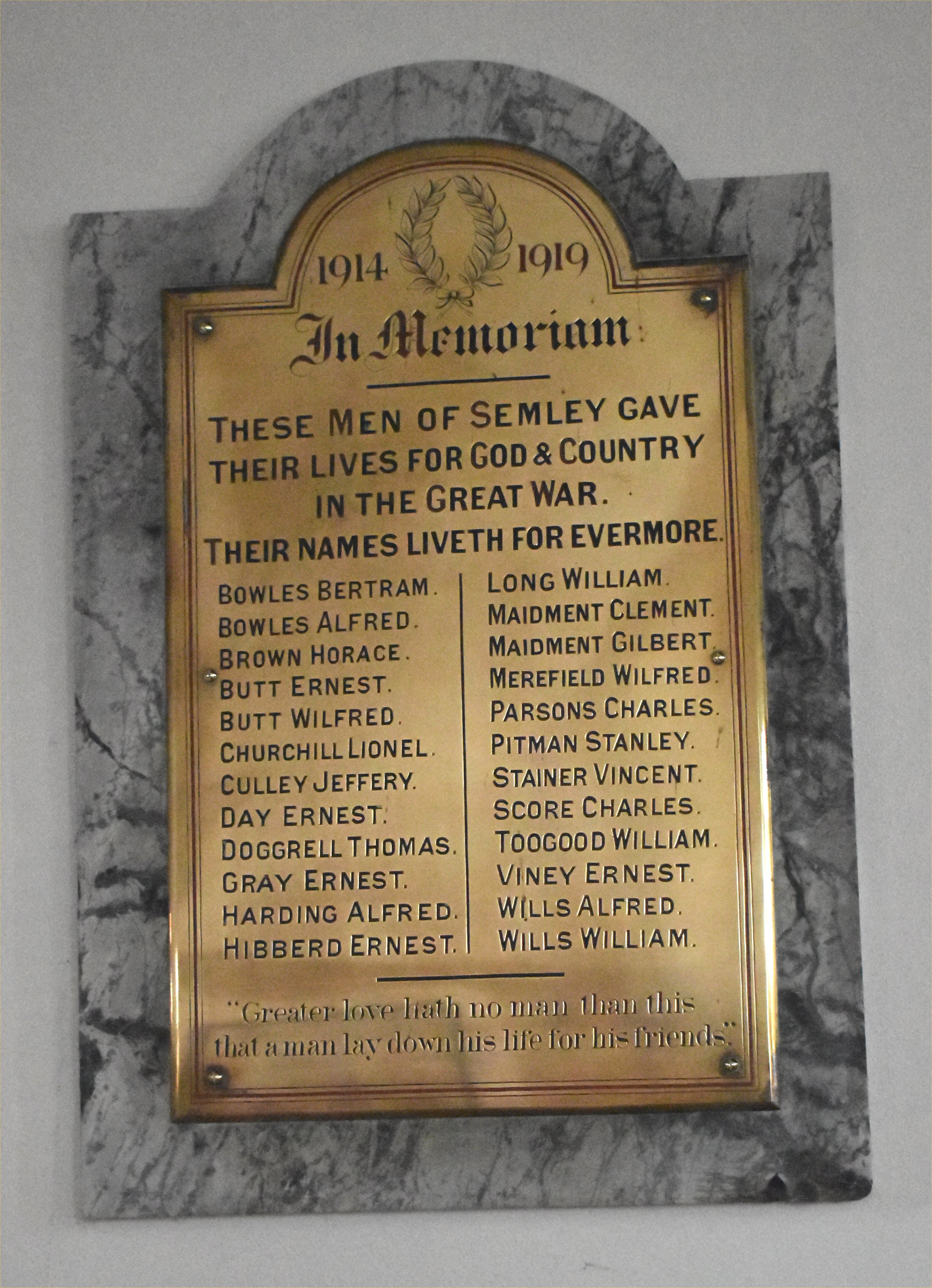 1914 1919 In memoriam These men of Semley gave their lives for God and Country in the Great War. Their names liveth for evermore.