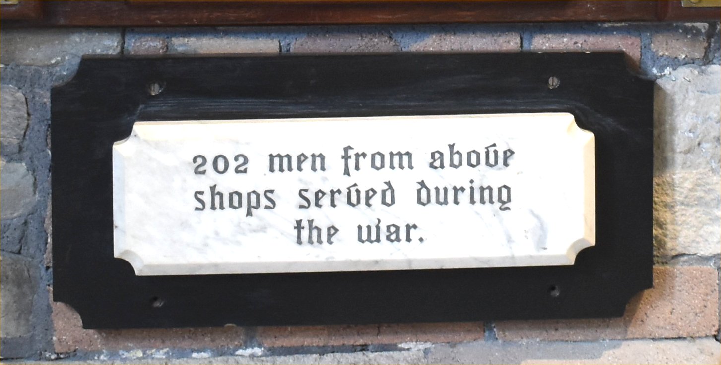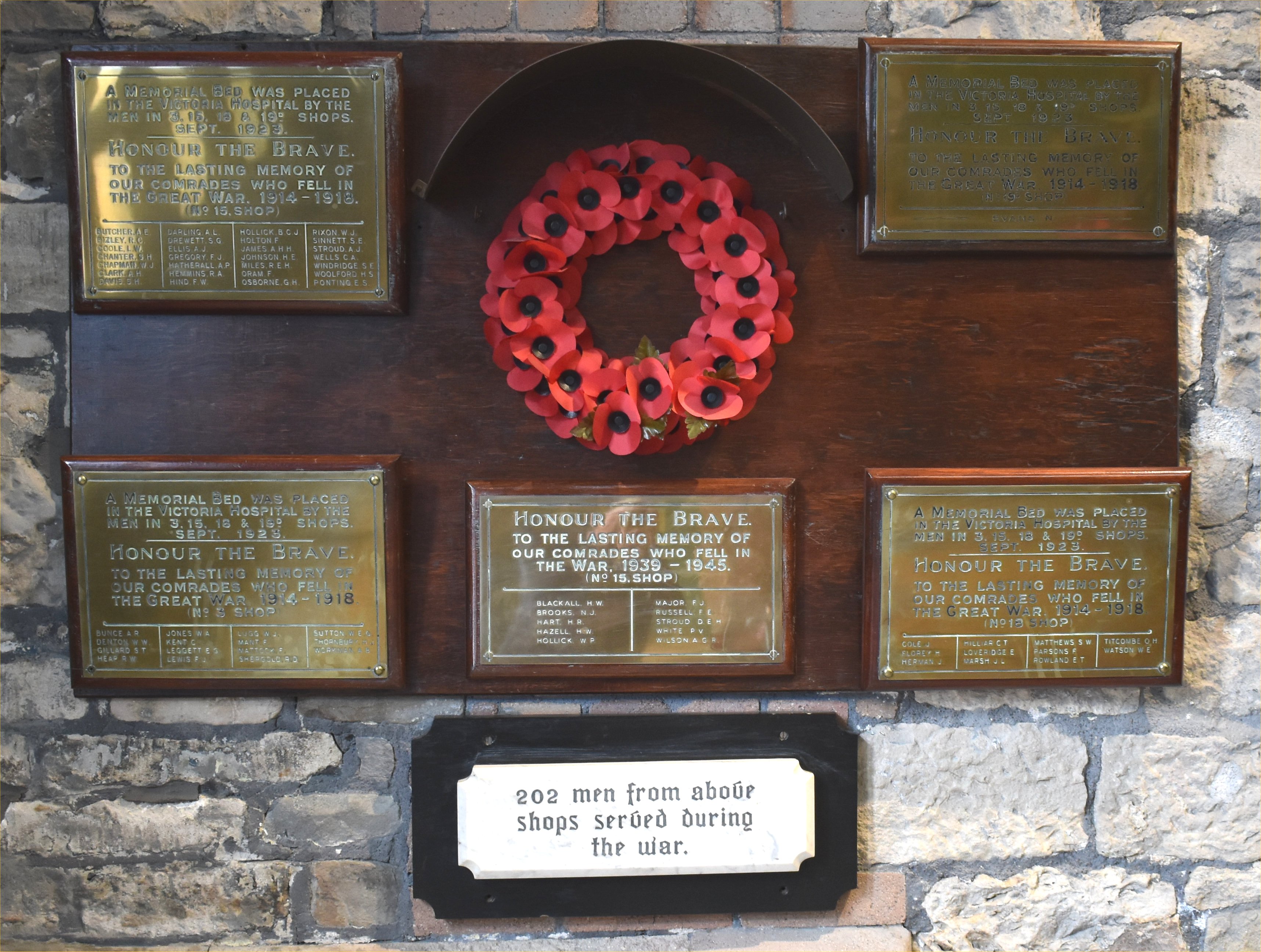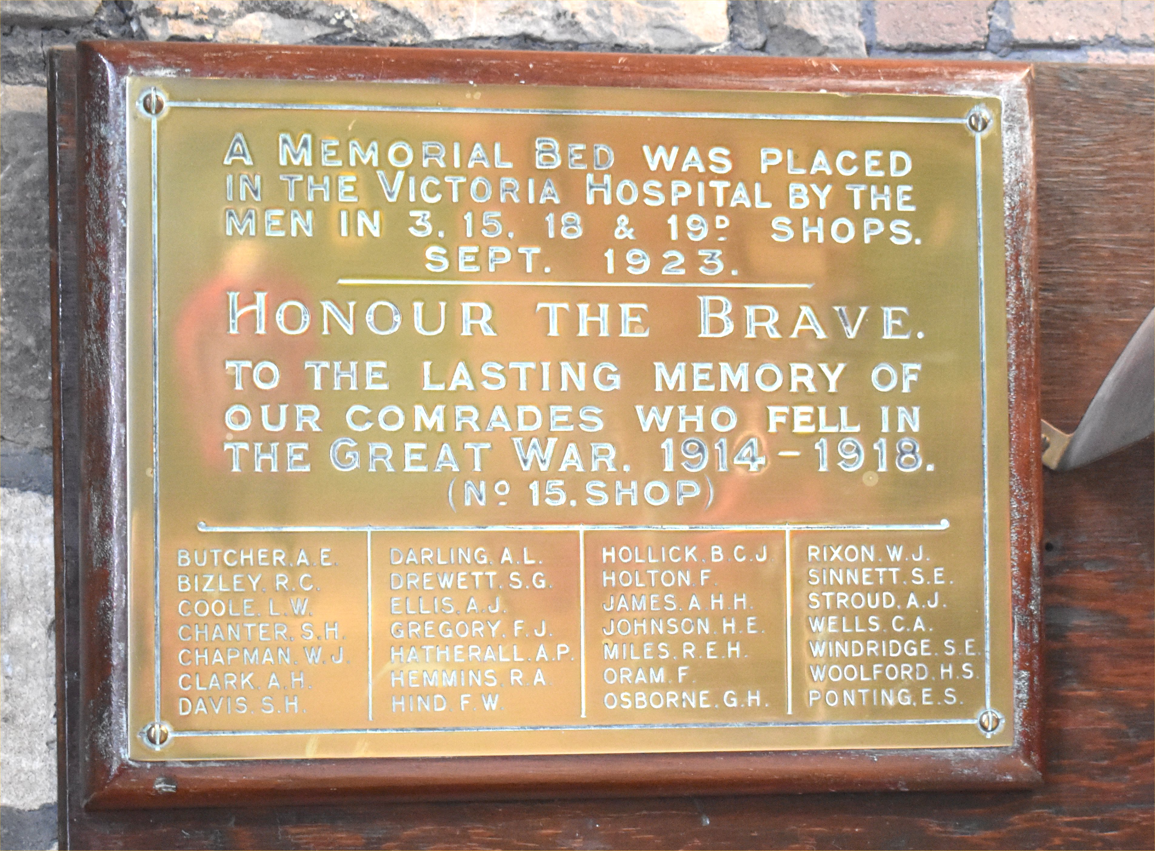 A Memorial Bed was placed in the Victoria Hospital by the men in 3, 15, 18 & 19D shops. Sept. 1923. ---------------- Honour the Brave. To the lasting memory of our comrades who fell in the Great War. 1914-1918. (No. 19D shop) ---------------- Evans, N.