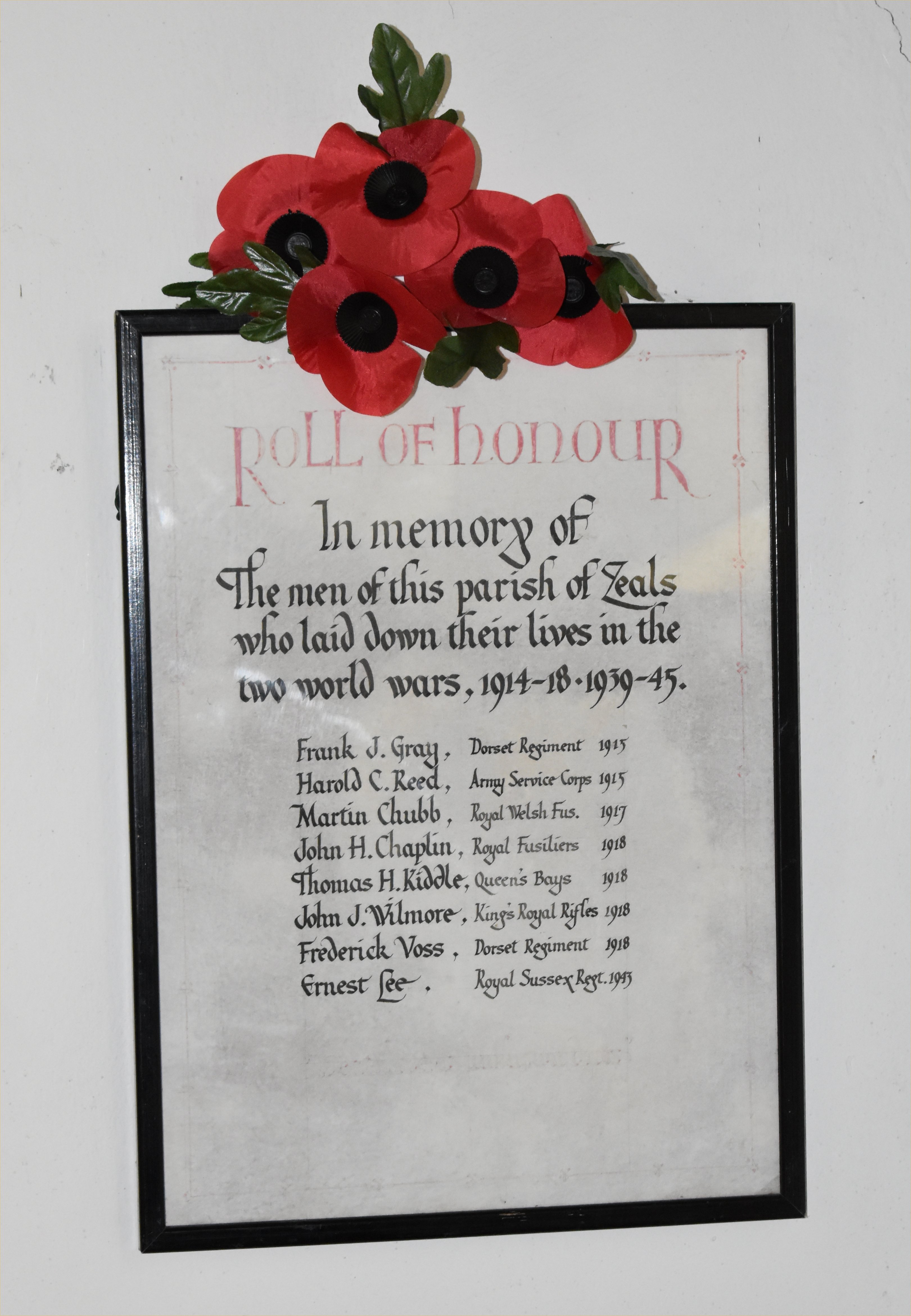 Roll of Honour In memory of The men of this parish of Zeals who laid doen their lives in the two world wars, 1914-18 * 1939-45.