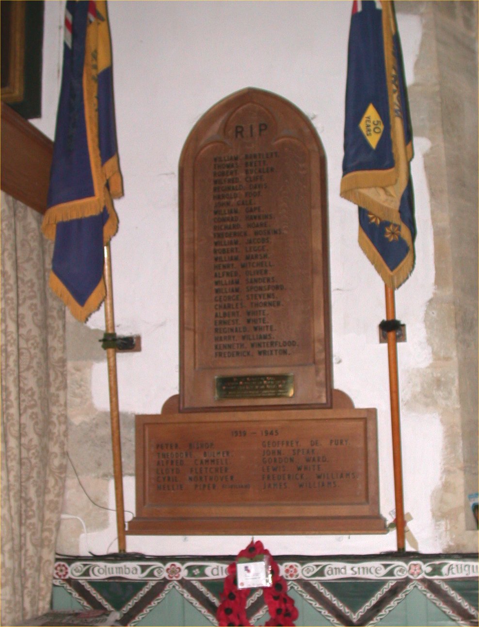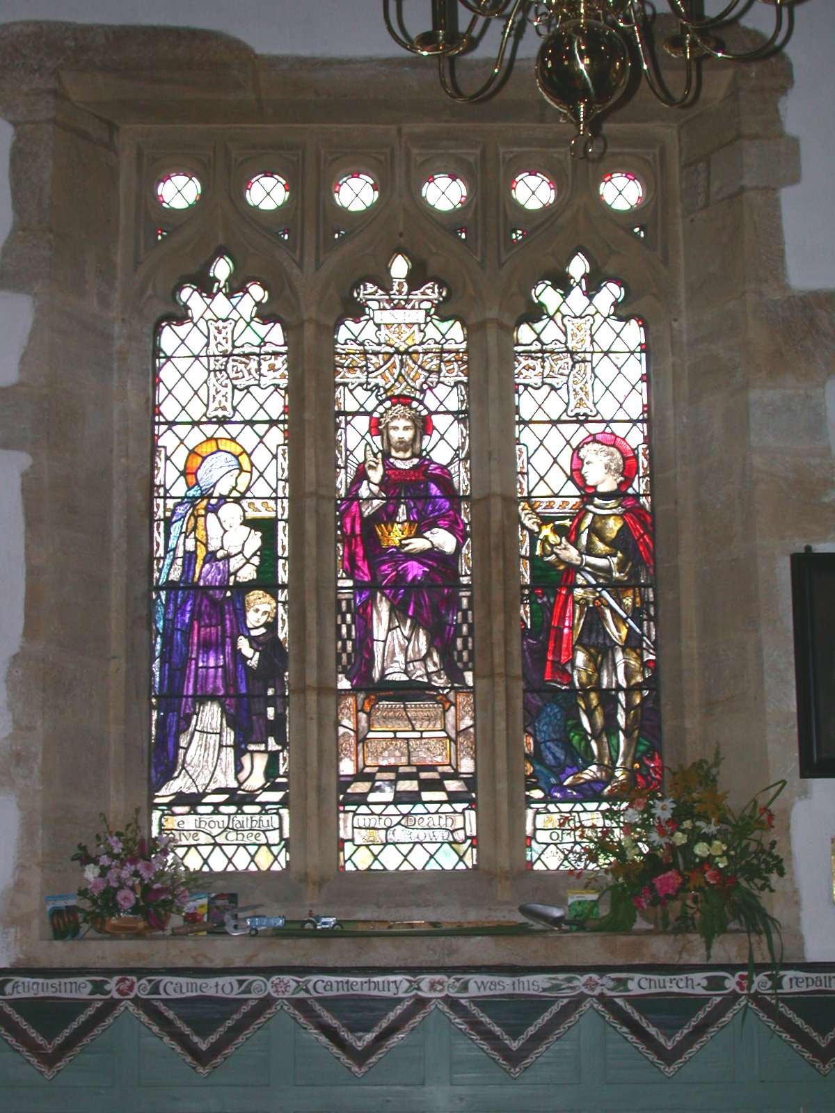 To the Glory of God and in Loving memory of the Men of this Parish Who gave their Lives in the Great War. This Tablet together with the Stained Glass Window is Erected by their Greatful fellow Parishioners and Friends.