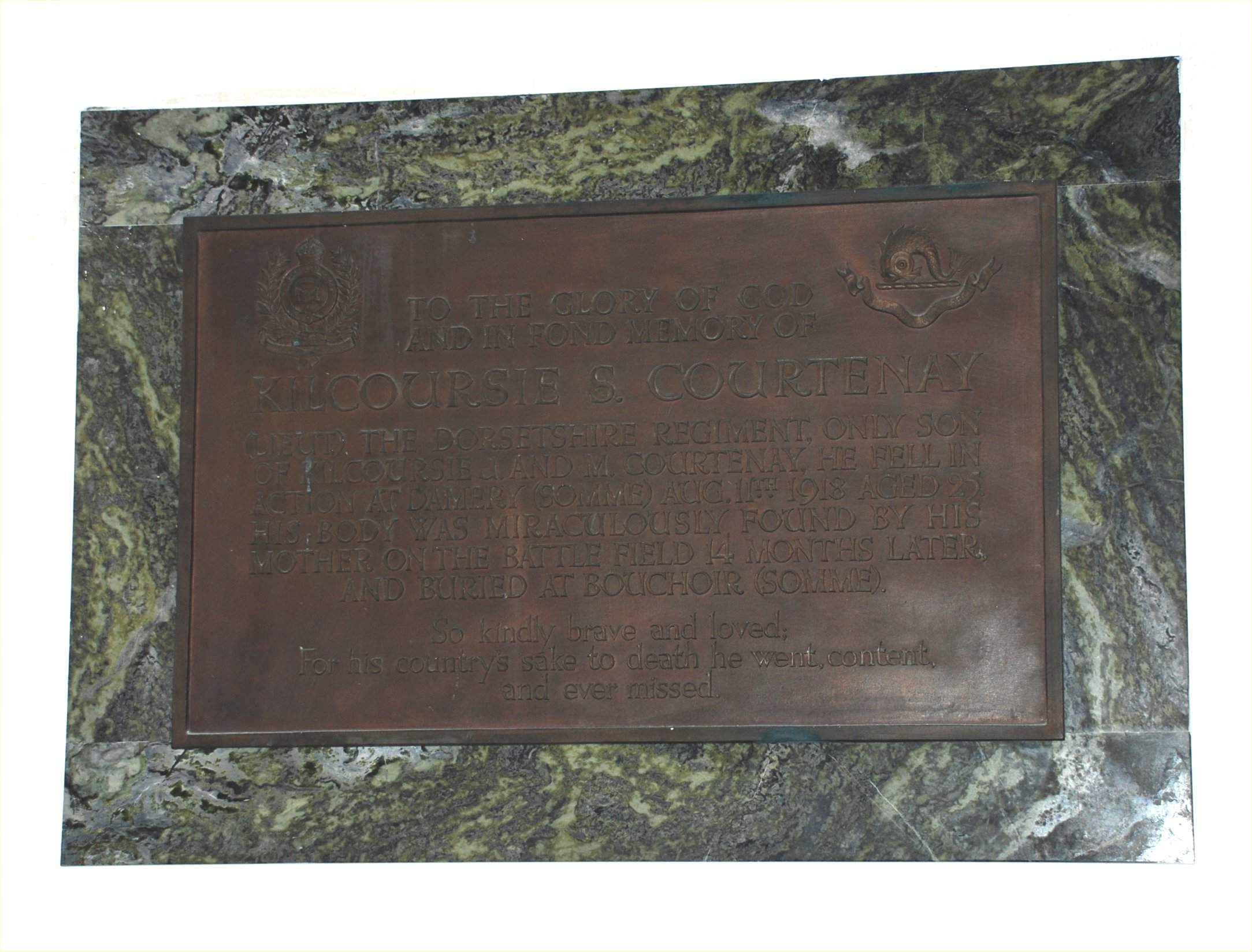 To the Glory of God and in fond memory of Kilcoursie S. Courtenay (Lieut) the Dorsetshire Regt, only son of Kilcoursie J. and M. Courtenay, he fell in action at Damery (Somme) Aug. 11th 1918 aged 25. His body was miracously found by his mother on the battle field 14 months later, and buried at Bouchoir (Somme). So kindly brave and loved: For his country's sake to death he went, content, and ever missed.