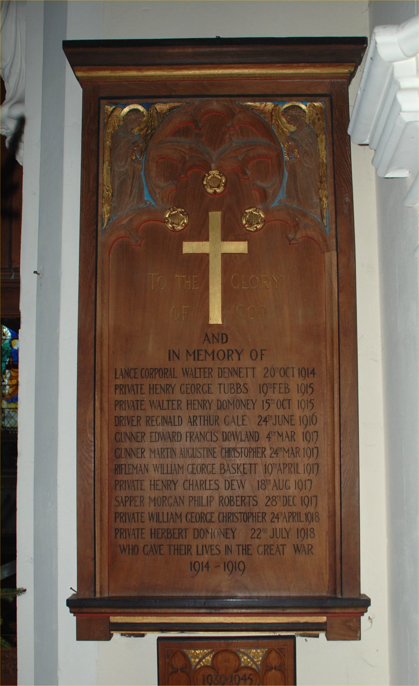 Wooden plaque on wall in St Mary, St Cuthberga & All Saints Church.