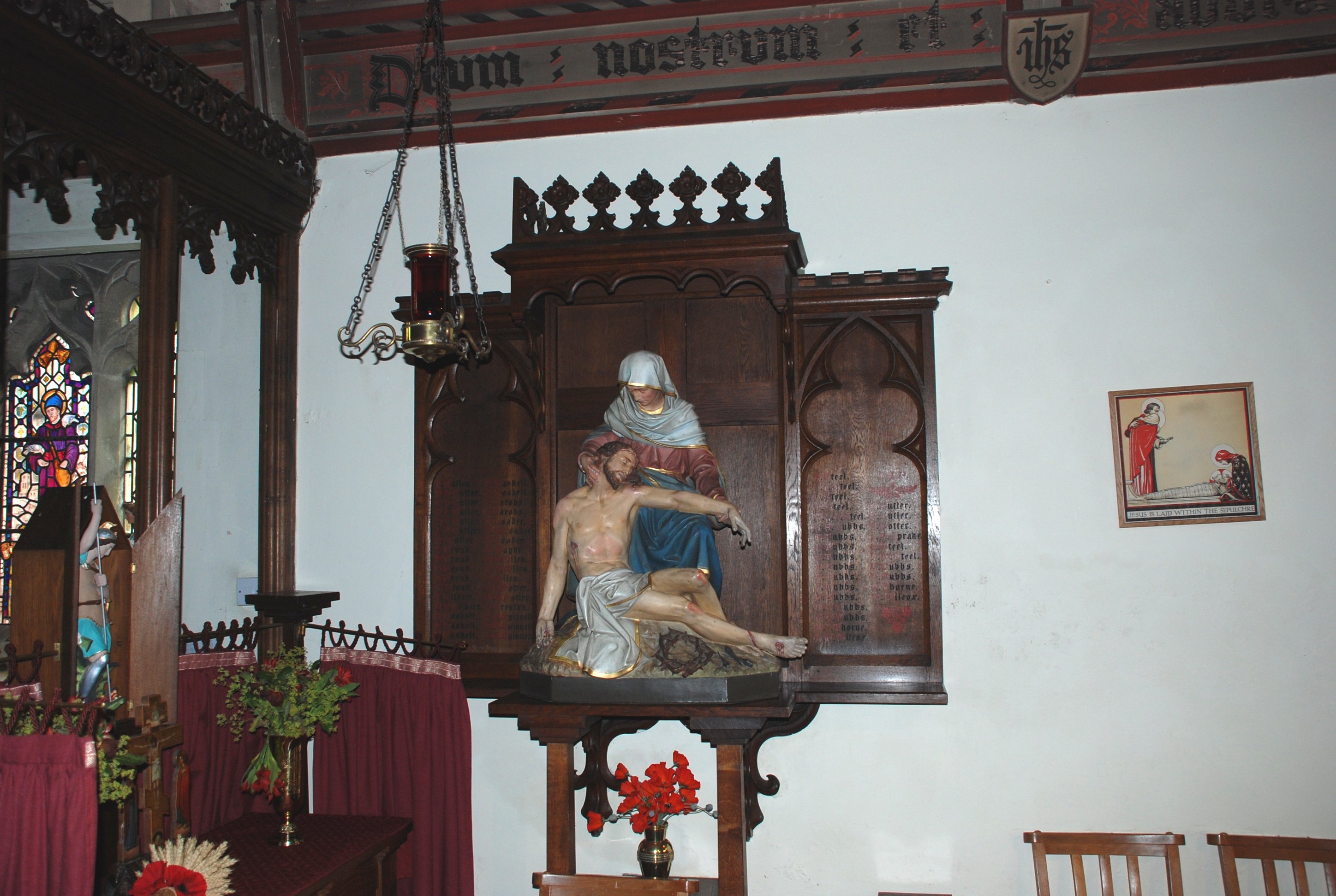 Wooden triptych on wall in the Church of the Assension, names on left & right panels.