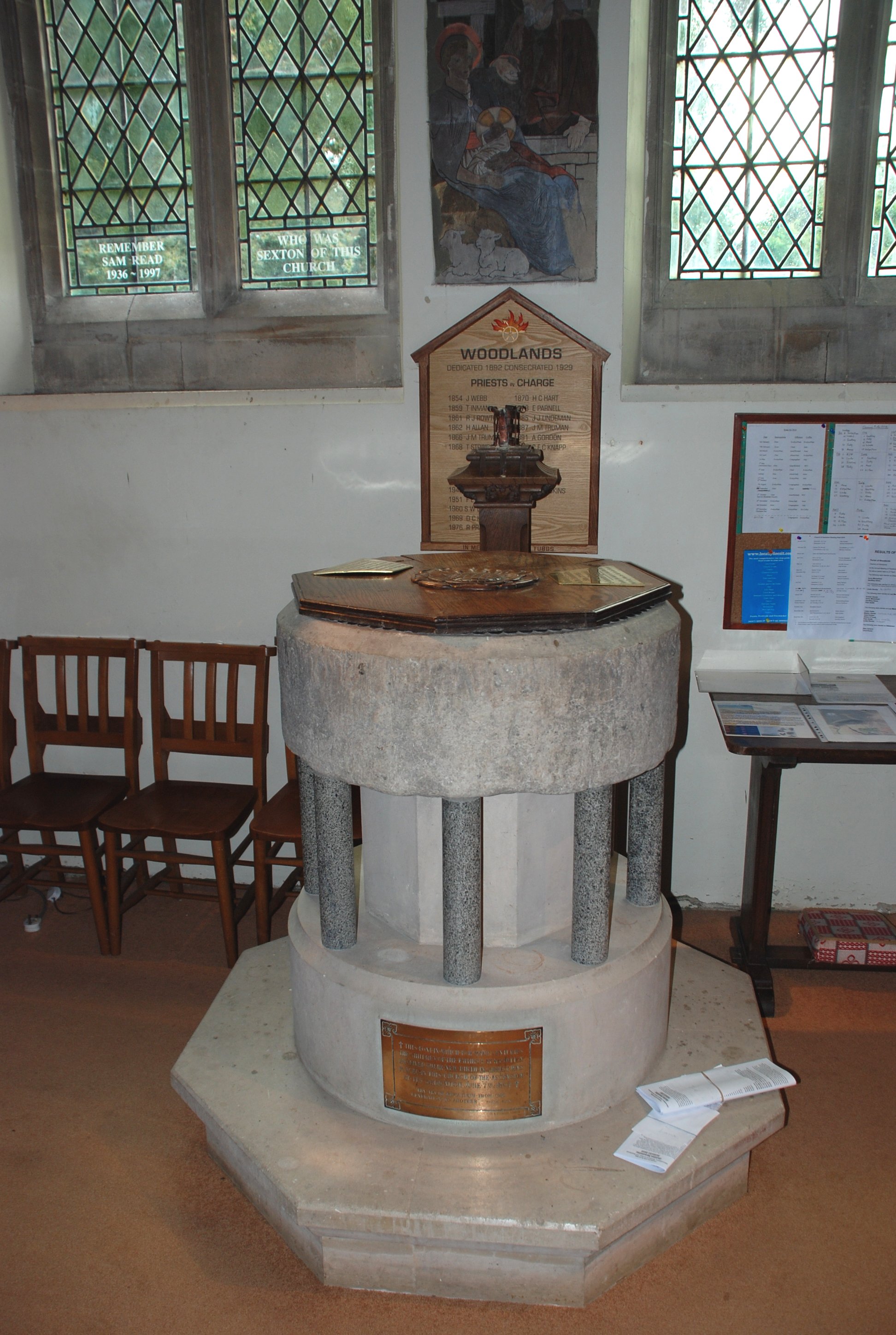 Two brass plaques loose on top of font cover.
