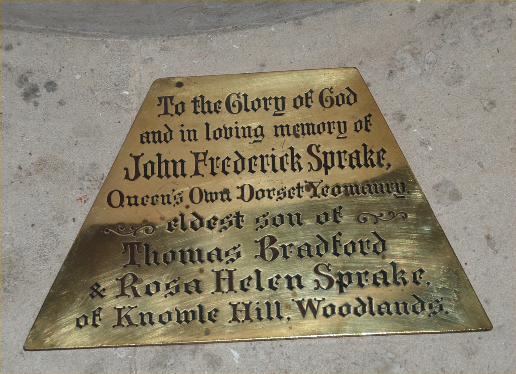 To the Glory of God and in loving memory of John Frederick Sprake, Queen's Own Dorset Yeomanry eldest son of Thomas Bradford & Rosa Helen Sprake of Knowle Hill, Woodlands.