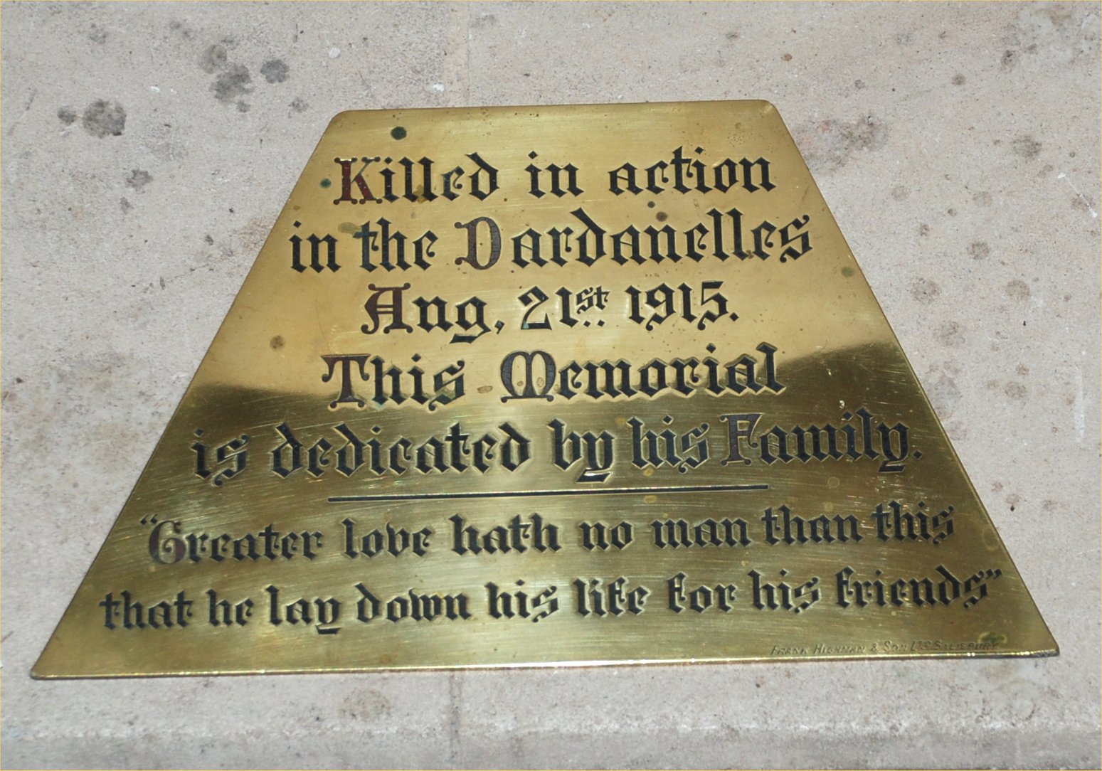 Killed in action in the Dardanelles Aug. 21st 1915. This Memorial is dedicated by his family "Greater love hath no man than this that he lay down his life for his friends"