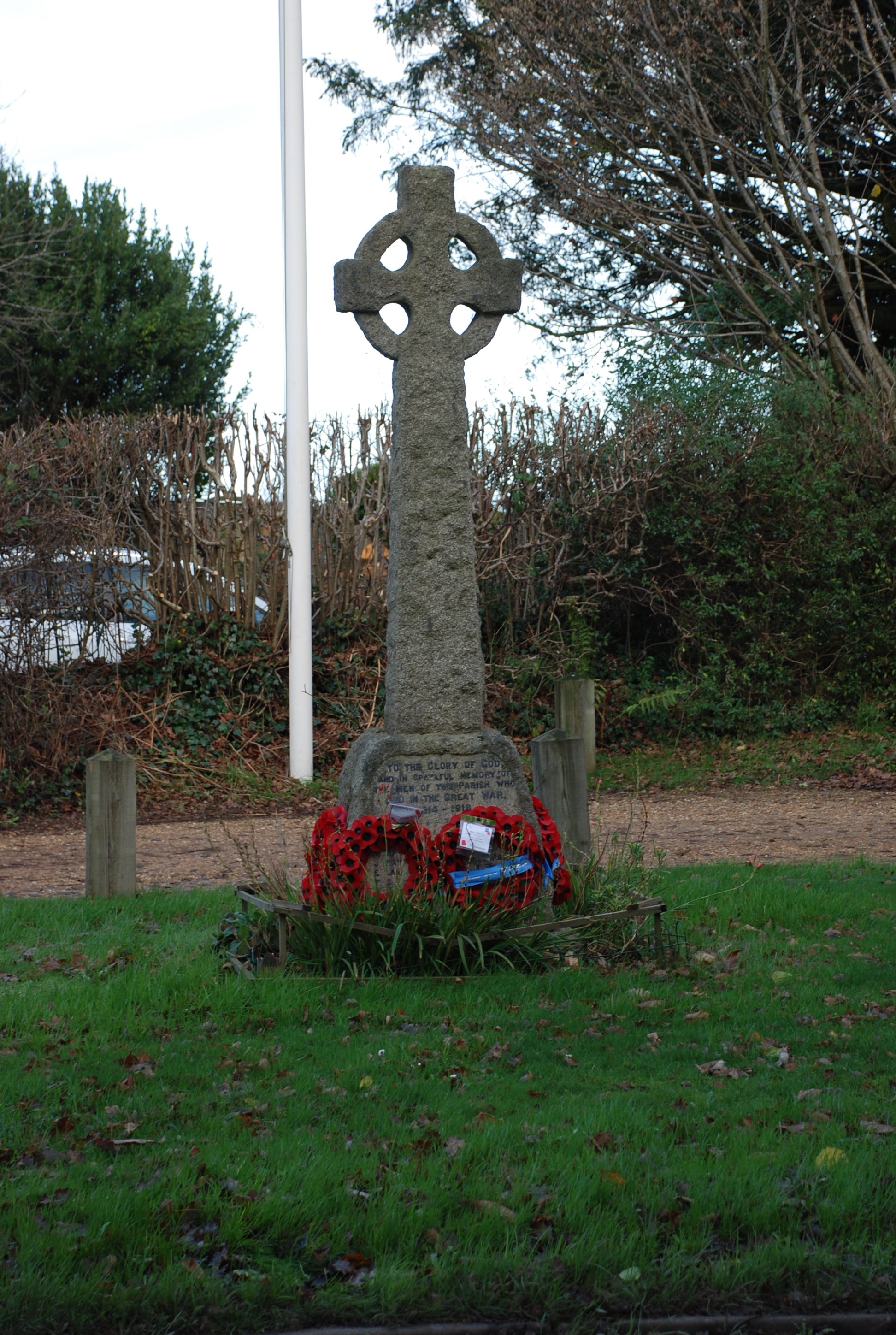 Stone cross on plinth in St James the Great Churchyard, on right side face of plinth.