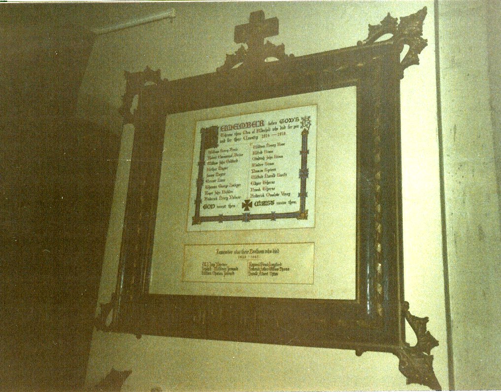 Hand written scroll added below Great War inscription in glazed frame on wall in St James the Great Church.