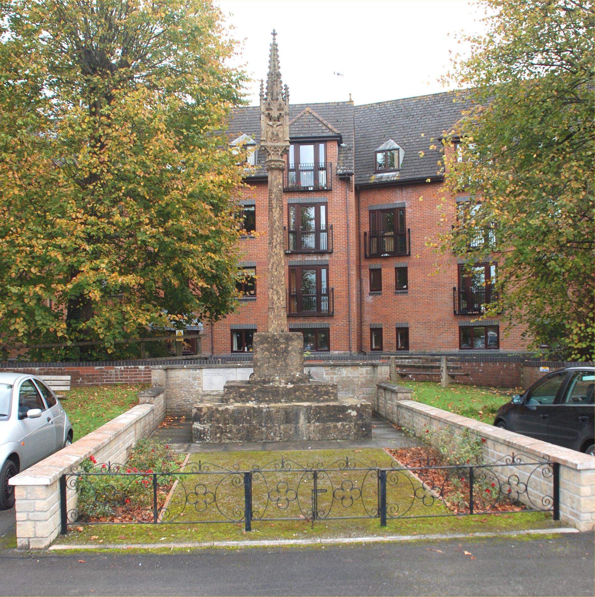 Stone cross in car park in town centre with plaques on wall behind, originally by road.