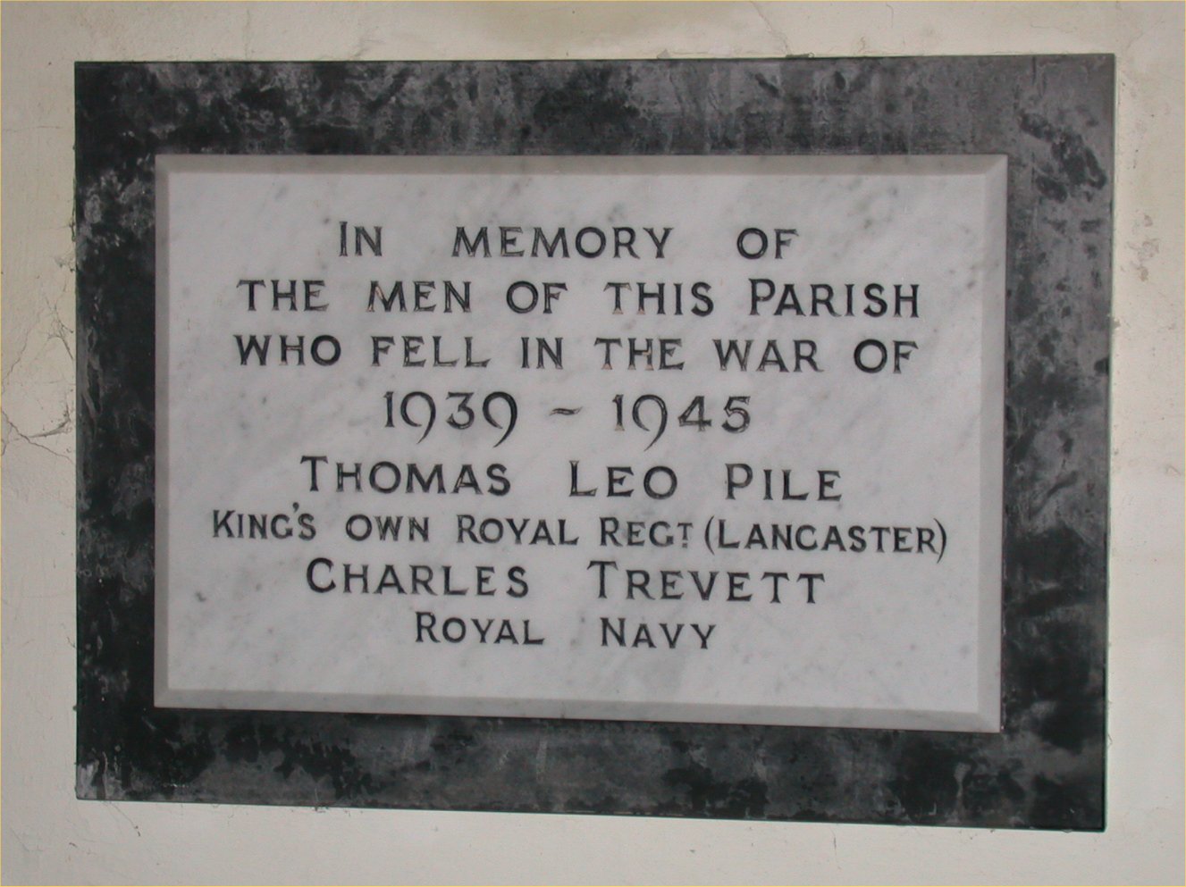 In memory of the men of this parish who fell in the war of 1939 - 1945 Thomas Leo Pile King's Own Royal Regt. (Lancaster) Charles Trevett Royal Navy