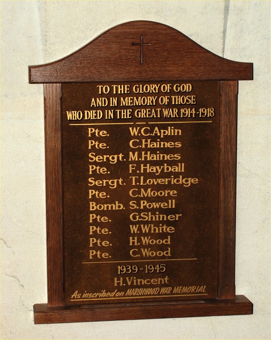 To the Glory of God and in memory of those who died in the Great War 1914-1918 (now WW1 names) 1939 - 1945 H. Vincent As inscribed on Marshwood War Memorial