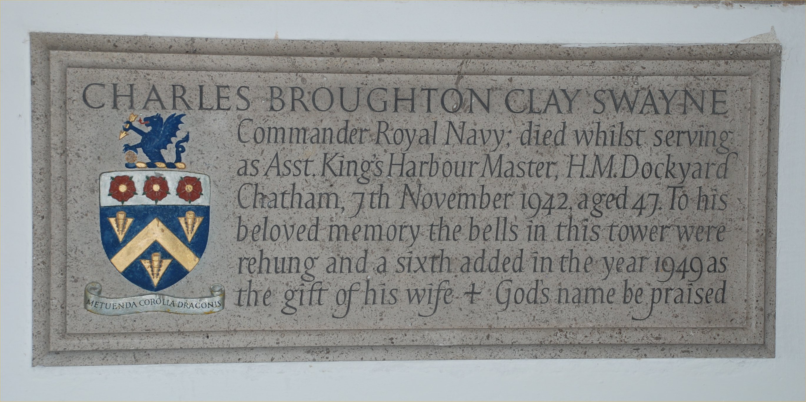Charles Broughton Clay Swayne Commander Royal Navy; died whilst serving as Asst. King's Harbour Master, H.M. Dockyard Chatham, 7th November 1942 aged 47. To his beloved memory the bells in this tower were rehung and a sixth added in the year 1949 as the gift of his wife + God's name be praised