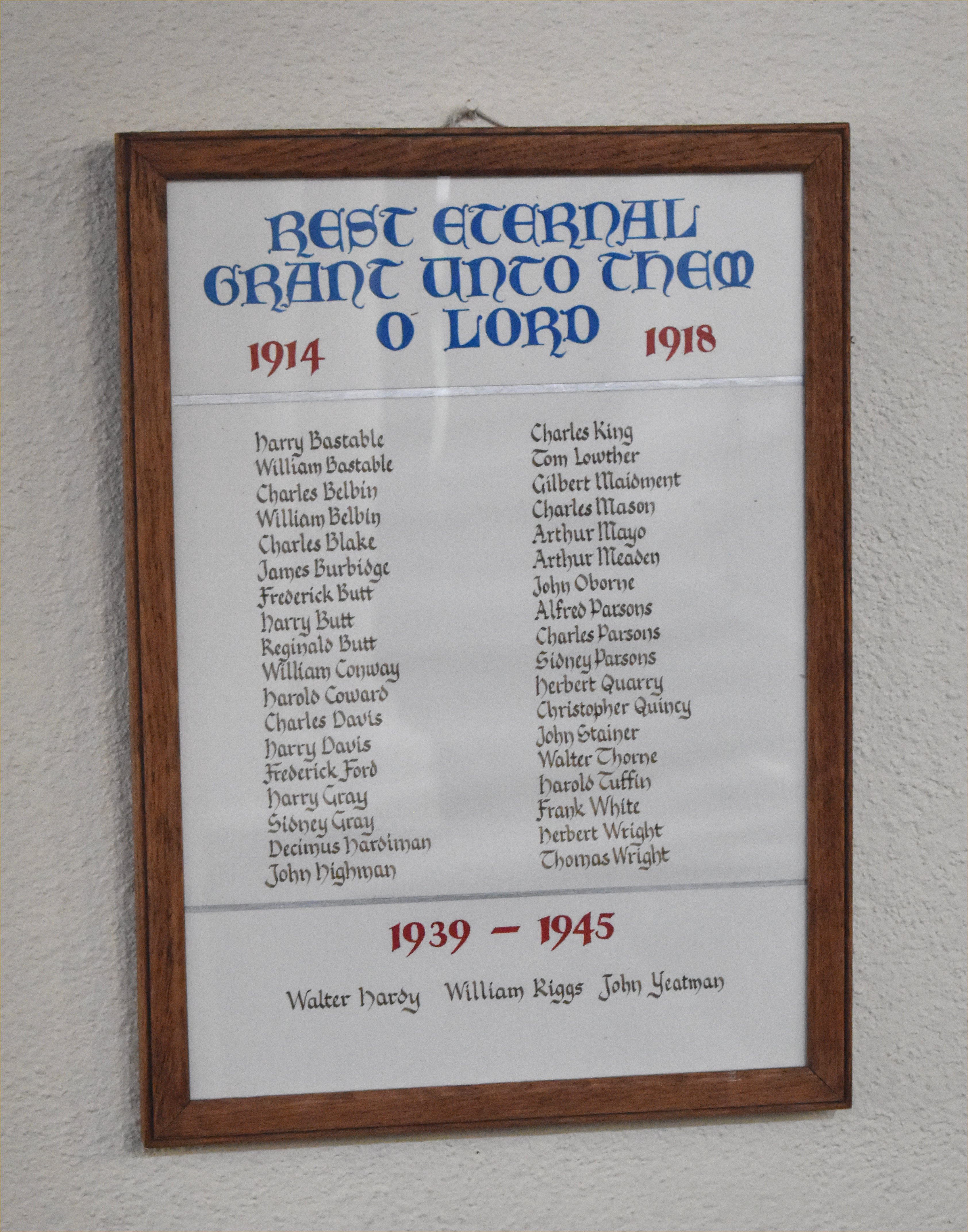 Rest eternal grant unto them O Lord 1914 1918 (now WW1 names) 1939 - 1945 Walter Hardy William Riggs John Yeatman