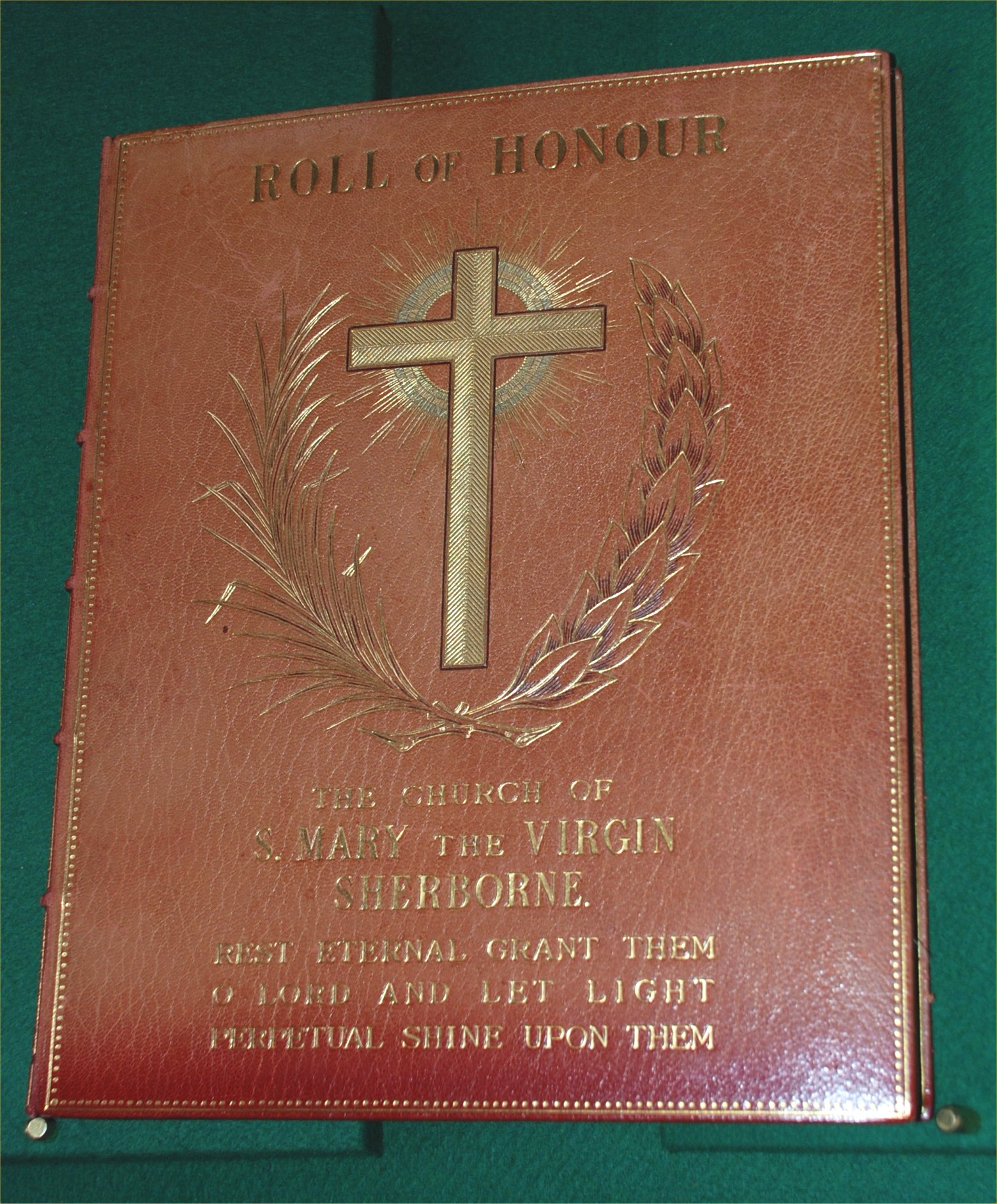 Bronze plaques on wall behind the Great War memorial cross in Sherborne Abbey churchyard.