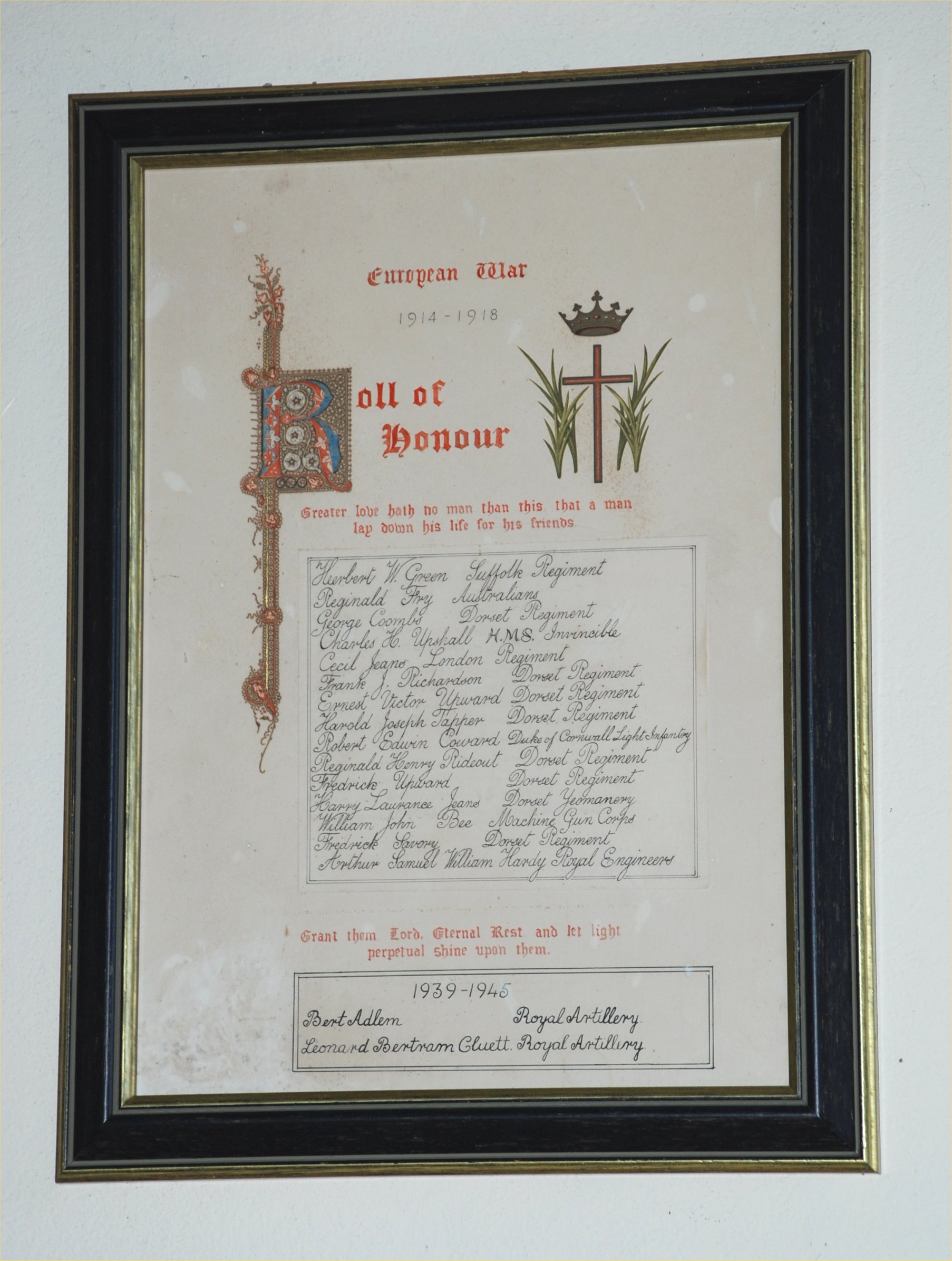 European War 1914 -1918 Roll of Honour Greater love hath no man than this that a man lay down his life for his friends. (now WW1 names) Grant them Lord, Eternal Rest and let light perpetual shine upon them.